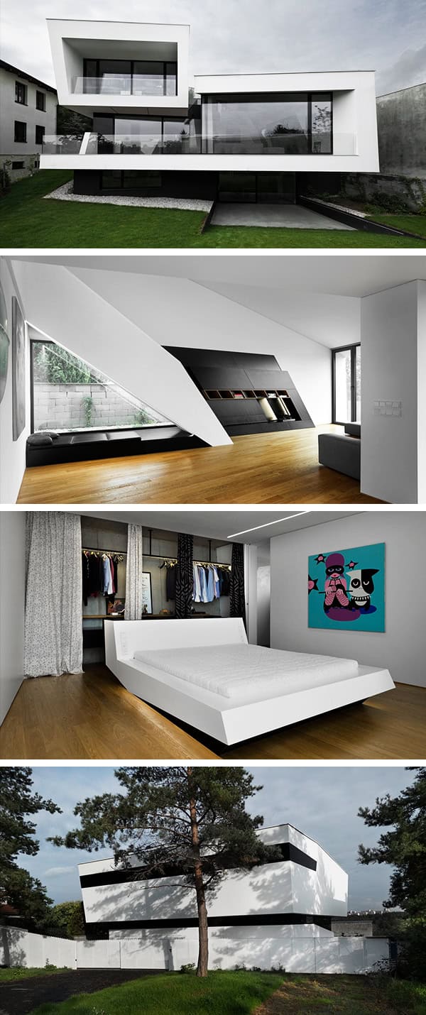 Closer Architects have designed this stunning three-story residence in the residential part of Prague in the Czech Republic. This futuristic looking villa offers 2,583 square feet of living space to its inhabitants. Its space is divided into three levels from which the first one is partly underground and it opens to the terrace and the garden on the south side while the middle floor is accessible at the same height as the road on the northern side of the residence. This is the largest level and it facilitates a garage for two cars, an entry hall, the main staircase, a restroom, two kitchens, a dining room and a living room.