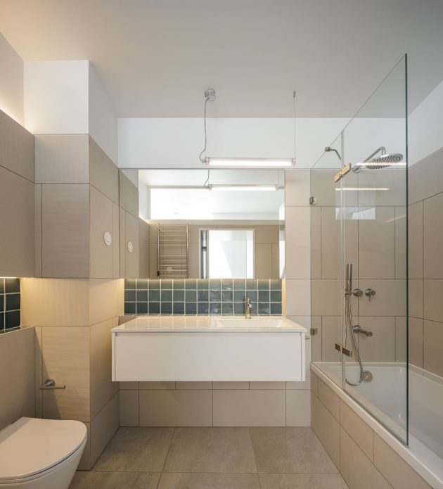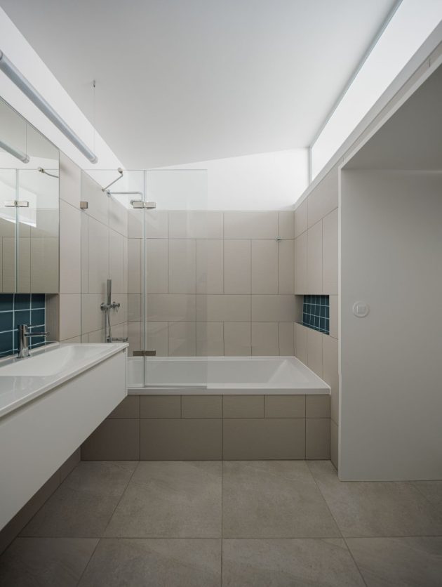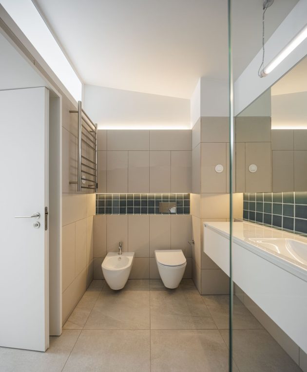 Natural light penetrates in a controlled way through the roof, by four large skylights that illuminate the circulation spaces and through the wide windows facing south, overlooking the lawn.