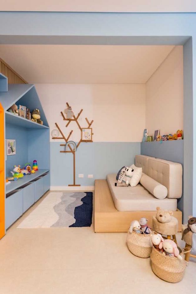 Bet on the use of niches and shelves with playful details. Do the same when choosing rugs.