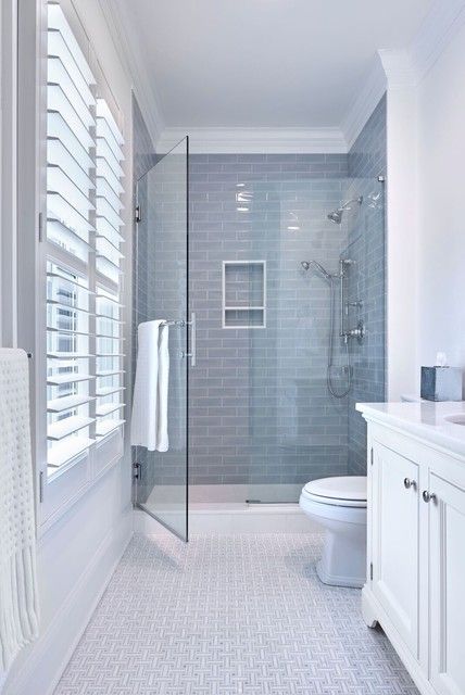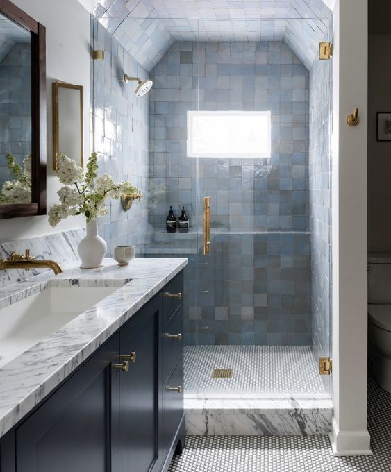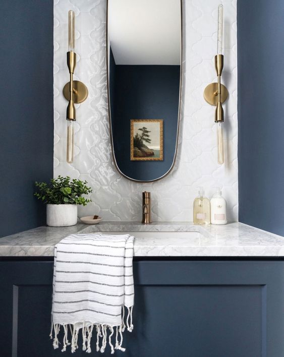 First of all, you have to ask yourself whether you want a completely blue bathroom or a bathroom with touches of blue. In the first case, the entirely blue bathroom, the good idea lies in the choice of materials to sublimate this colour. If the blue bathroom is dressed in a very light blue, we think of depositing this colour on the walls to illuminate it with white tiles. If the blue bathroom is dressed in a stronger and more intense blue, we do not hesitate to spread the colour from floor to ceiling, taking care to structure the whole with a base. Finally, if you prefer blue, which takes place sparingly, opt for an all-white bathroom enhanced with navy blue. This takes shape using bathroom linen (towels and bath mat). We like the pastel blue in touches when it goes with a pearl grey to create an old bathroom full of elegance.