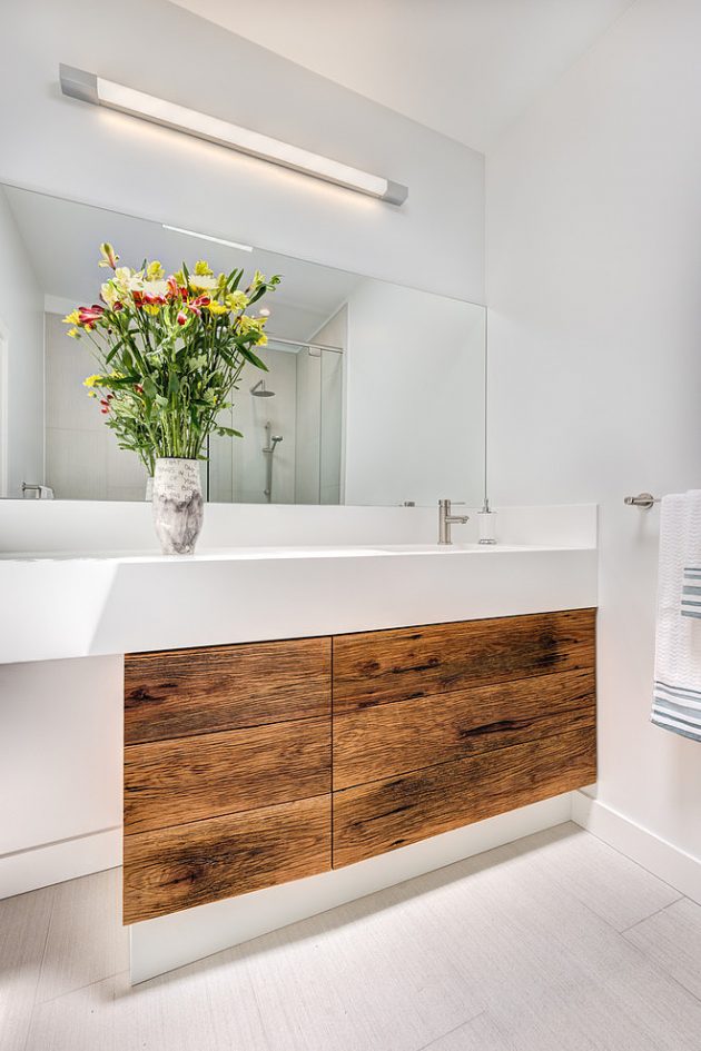 The master ensuite has a custom designed corian and oak vanity with an integrated sink and brushed-nickel faucet.