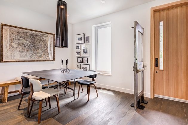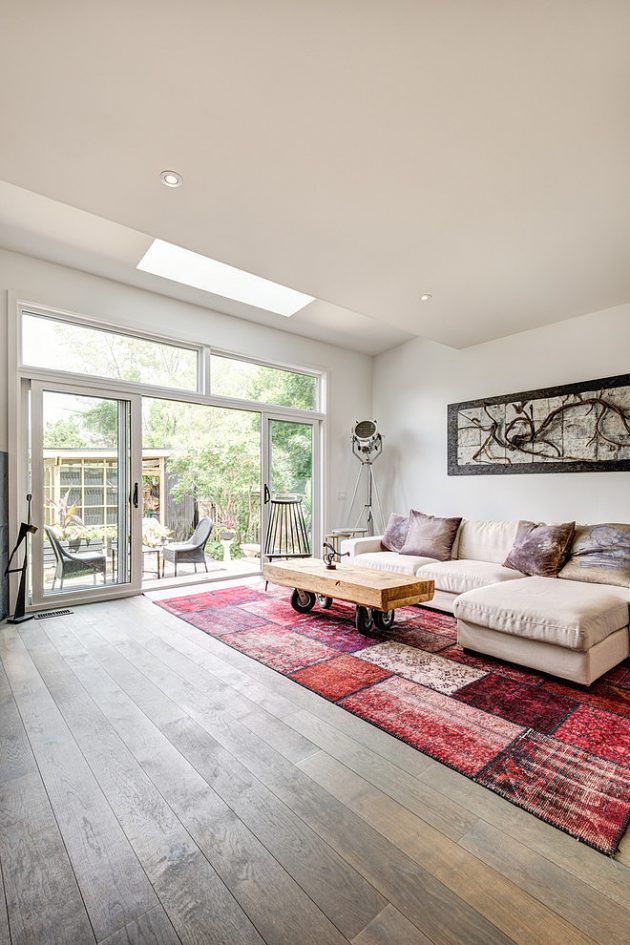 The original house was turned upside down and a second story was also added which allowed the architects to turn the main floor into a spacious living room and kitchen space that opens up onto the backyard while the front part of the house was turned into a dining room.