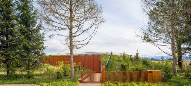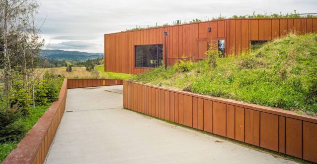 The roof, covered with earth structure including a layer of turf, has inscribed the house into the context of the place and reduced the impression of its presence at the background of Ortyt – a picturesque and hilly Bieszczady mountain range. The design, with its owner’s hunting fascination in mind, is supposed to emphasize the beauty of the location, without interfering with its atmosphere.