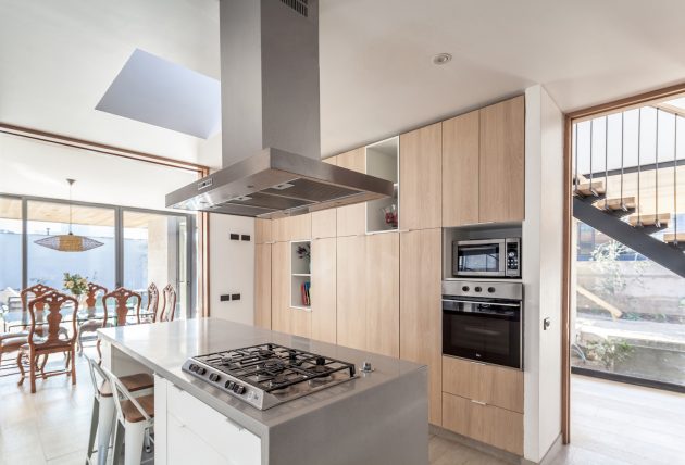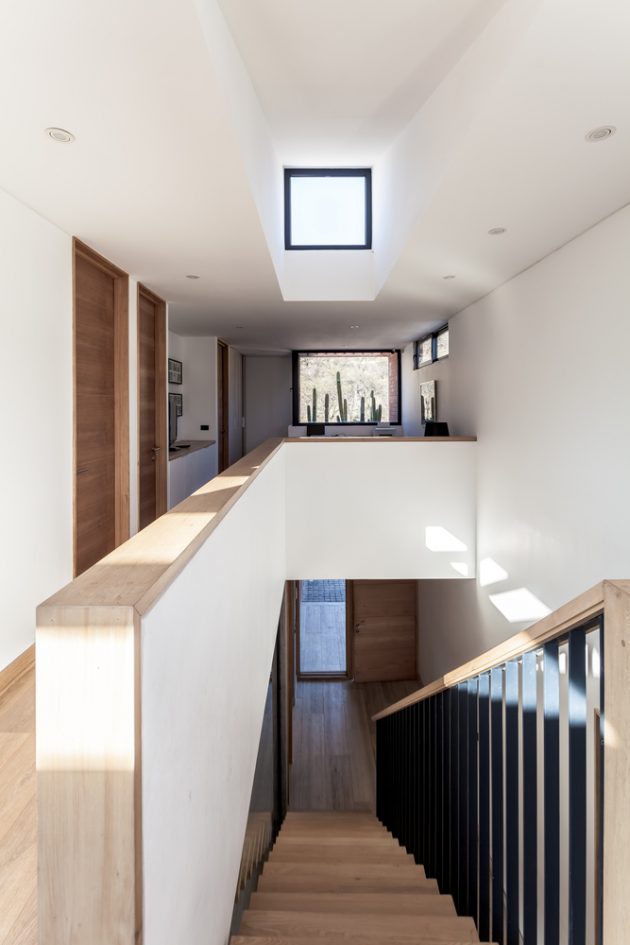 At the same time, framing is worked with the presence of a linear staircase as an element that accompanies the transfer route of the house, distributing and giving spatiality to the circulation circuit. Structurally the project is composed of means of a defined basement in reinforced concrete that supports the chassis of a light mezzanine slab, on which the upper volume built-in Ecowall panels is composed.