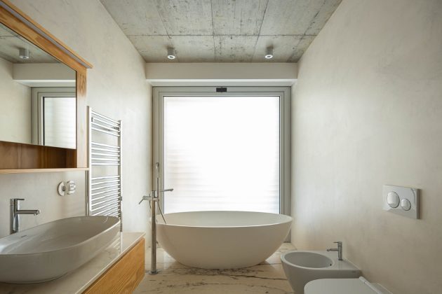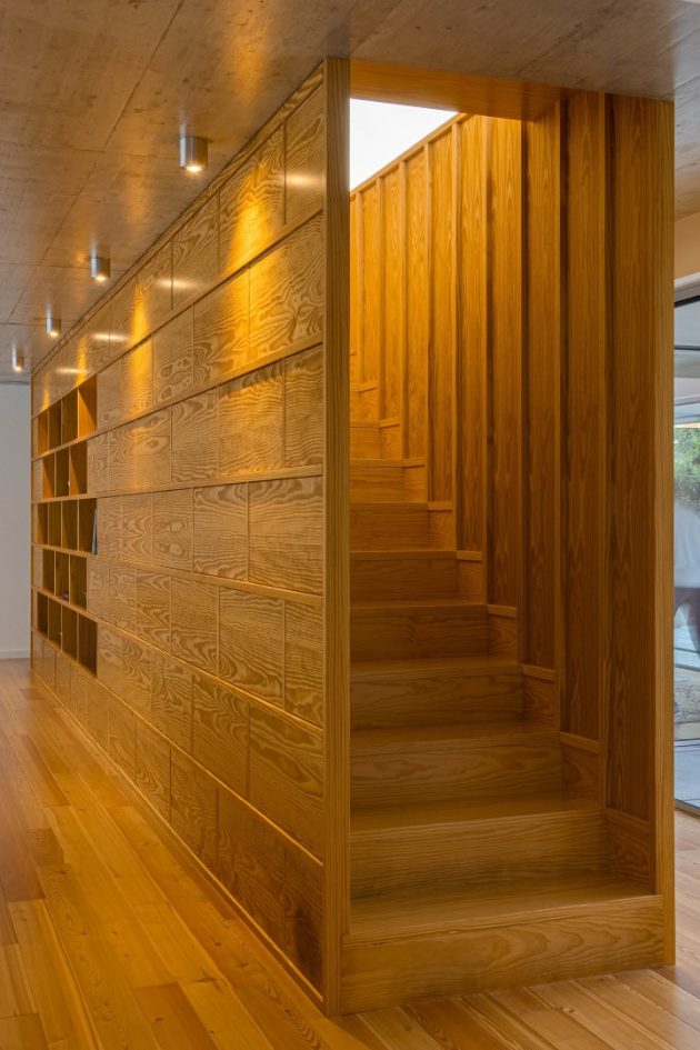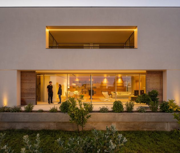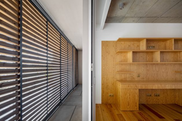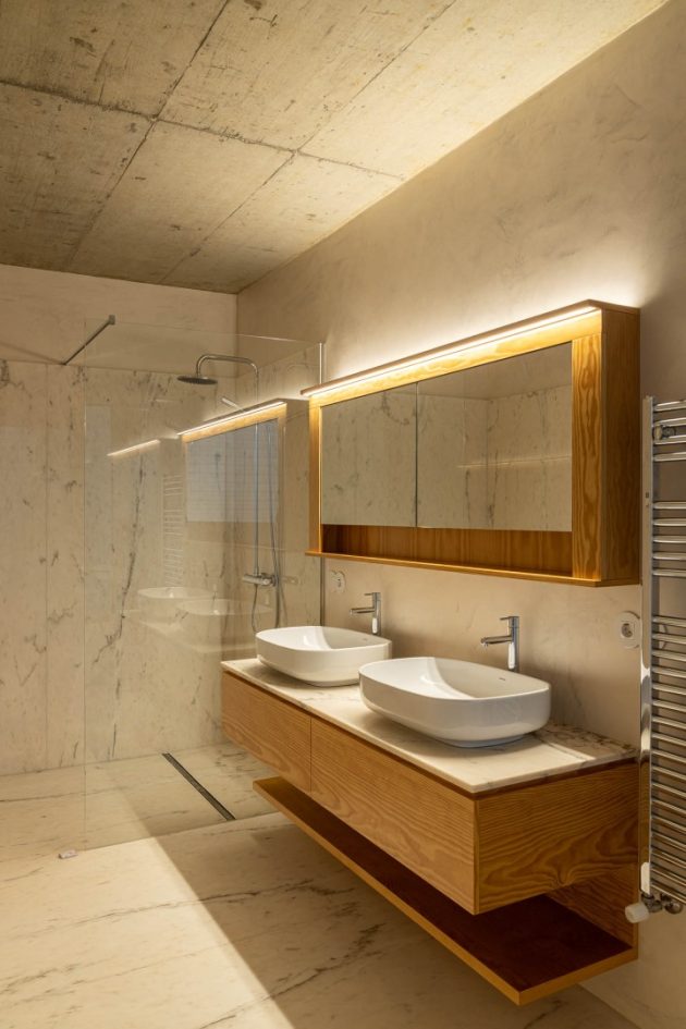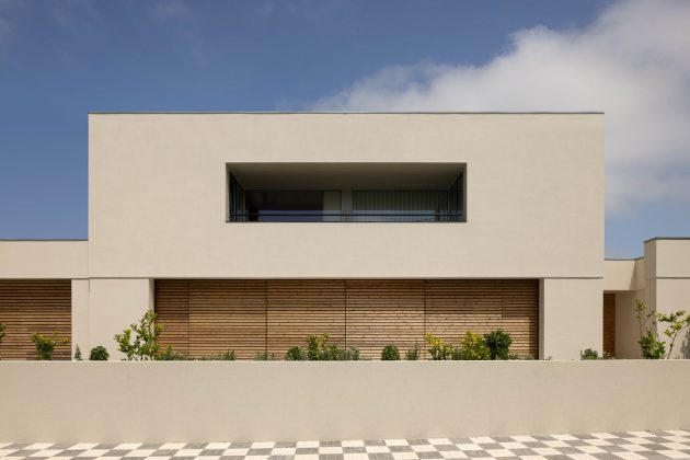 On the outside, natural materials are preferred, such as granite or wood in the shutters, but it is the huge concrete slabs and the finishing of all the facades in cream-colored bituminous paste that bring a visual balance, a sober presence on the street.