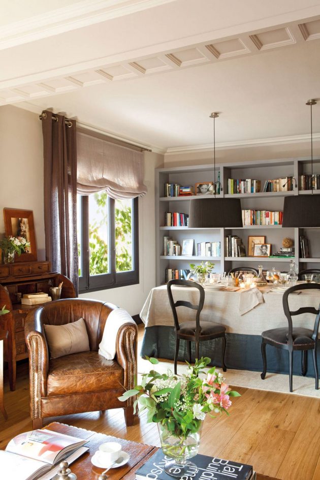 The key to this work corner that we see on the right is that it maintains the same decorative style as the shelf that presides over this space, made to measure. Light gray tone and classic details, such as the moldings on the shelf or the ribbed legs on the work table, are examples of this deliberate mimesis. A perfect and very pleasant corner from which to telecommute.