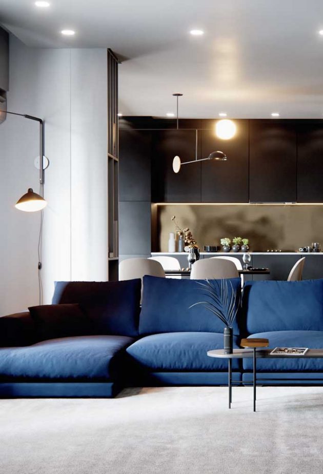 Far from being monotonous, the navy blue sofa manages to bring elegance, sophistication, and a lot of style to the decor.