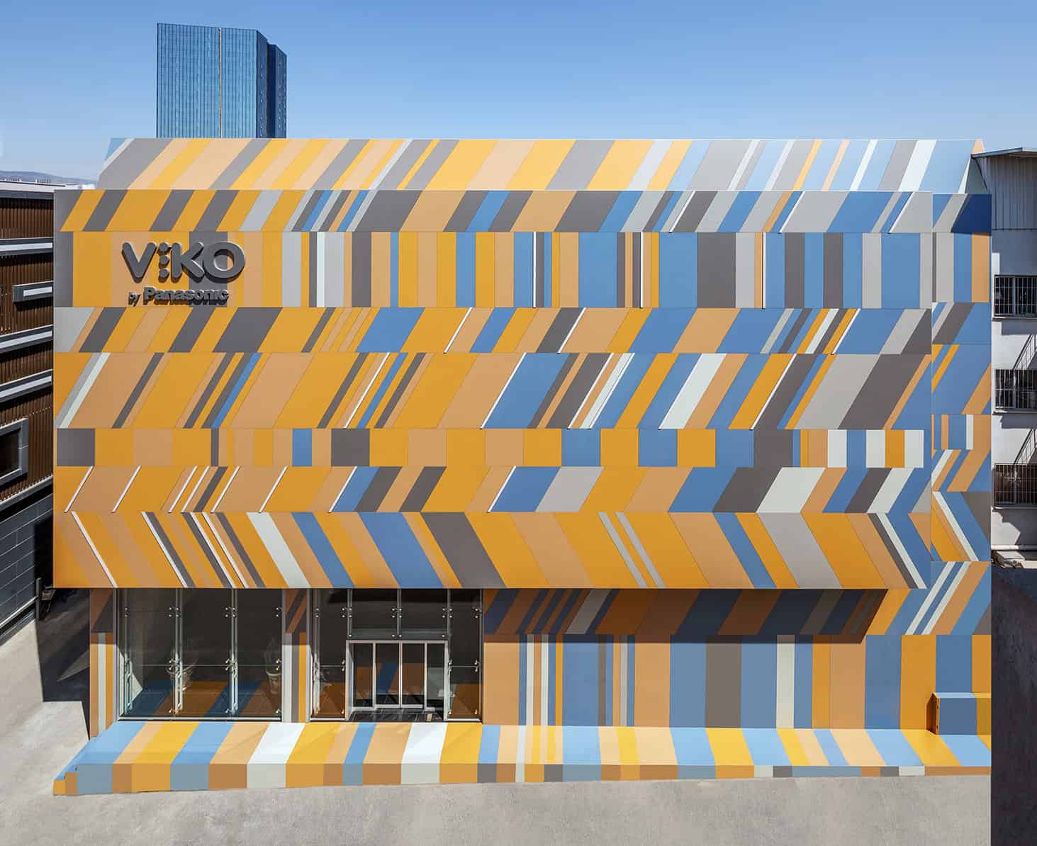 Vibrant geometric exterior facade of Viko by Panasonic building with colorful striped pattern and modern architectural design.