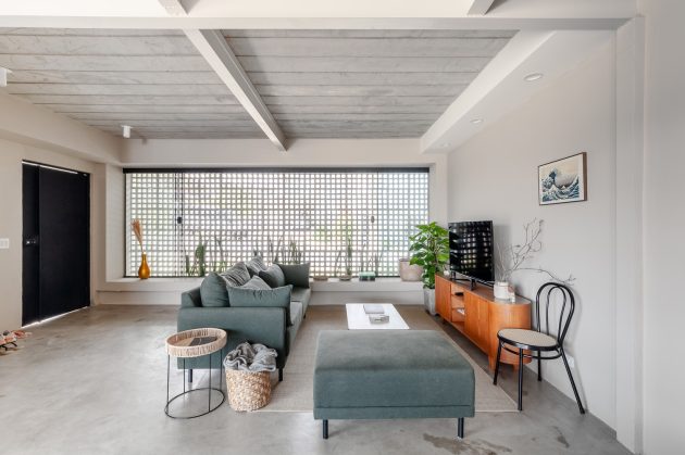 The fluidity of the ground floor helps in the two important factors: on its back, a large set of glass doors allows you to always enjoy the view of the horizon; and also when open, it complements the cross ventilation that passes through the whole house, thanks to the wall of hollow elements of the facade.