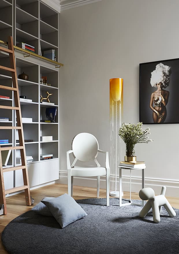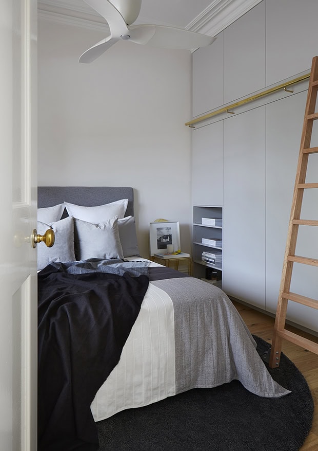 We created a floor to ceiling wardrobe in the bedroom and the same with a library shelf unit in the other room for our client’s book collection.