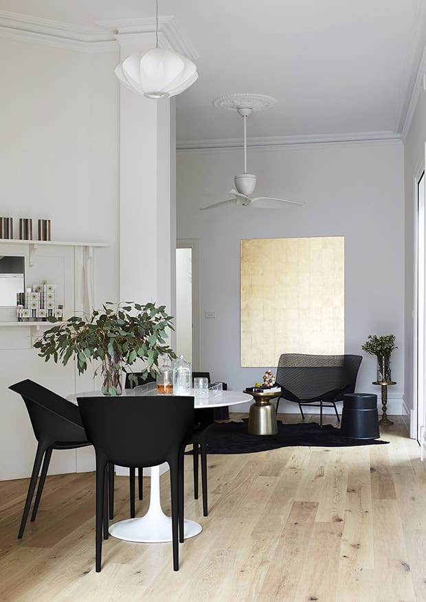 The existing internal plastered brick walls and the original ceiling including the ceiling roses and original cornices were fully restored. The internal walls including the new extension were given a fresh coat of paint in Natural White to give a more contemporary feel and the new smoked Oak timber floor provides warmth.