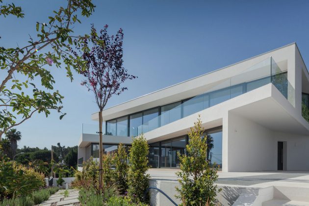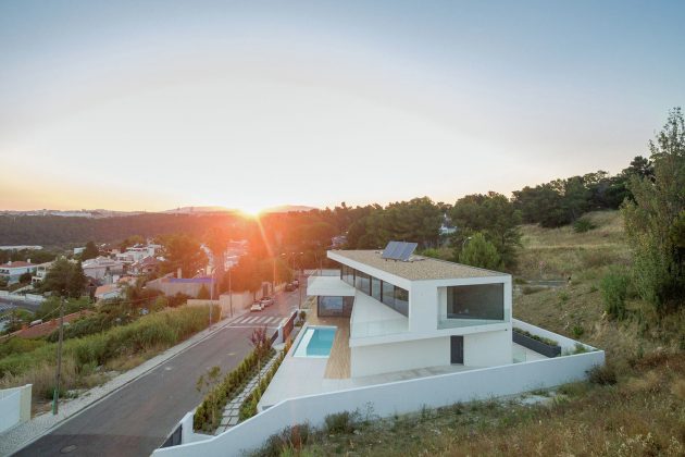 Located in one of the highest points in Oeiras, Portugal, with a view over the Tejo river and the Atlantic ocean, this house is based on a trapezoidal terrain which formed the concept for the creation of this project.