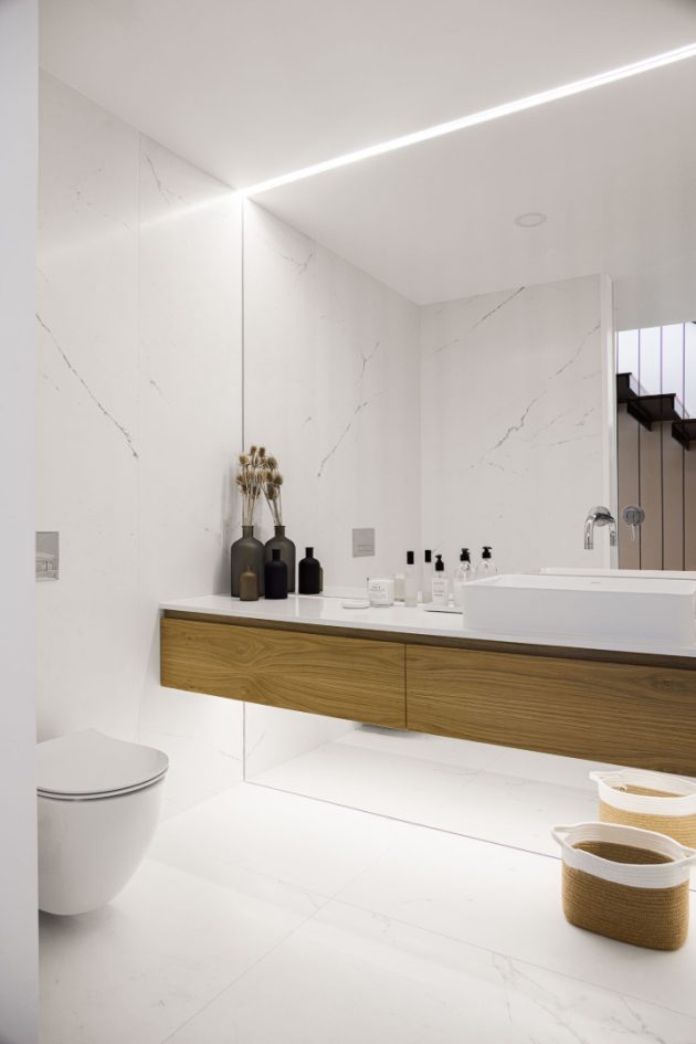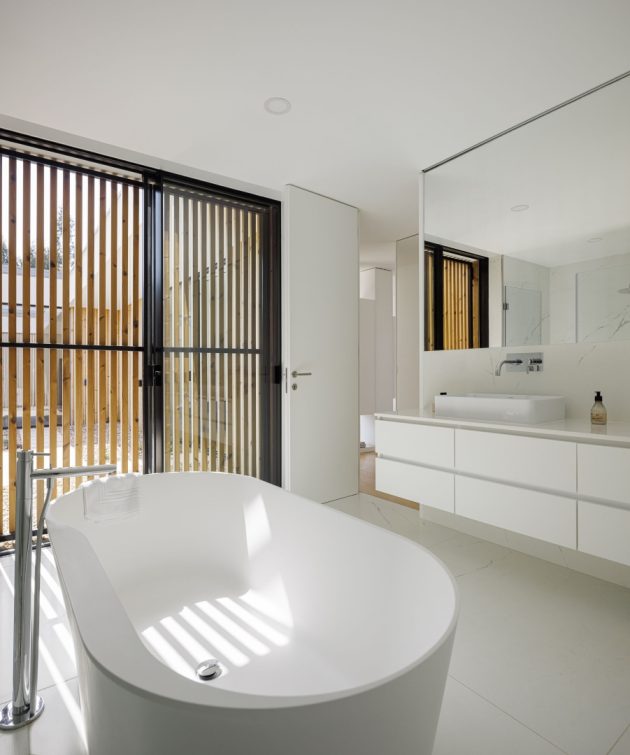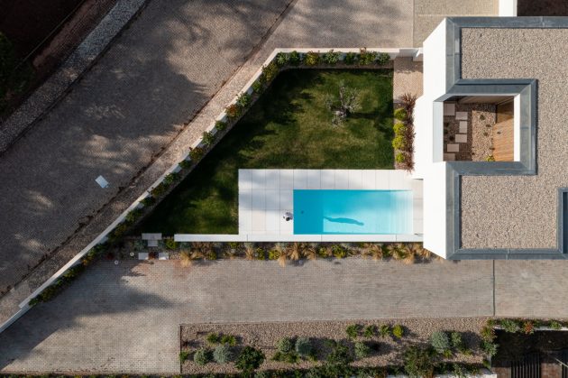 Its white materiality intends to expose the simplicity of the design of its contours as well as the simplicity of its organization/plan. The decomposition of the volume takes place in order to articulate the internal programmatic spaces of the house distributed on the various levels of the house with the unevenness of the terrain. In this way, the different spaces have a certain space outside the house to a certain sun exposure.