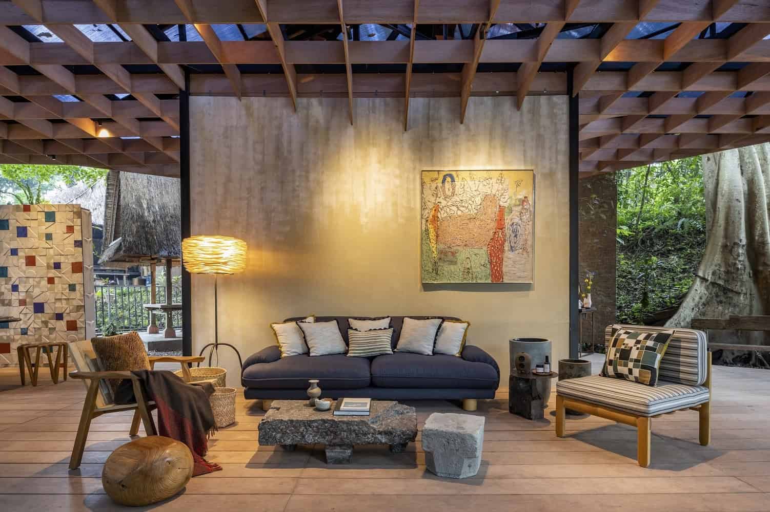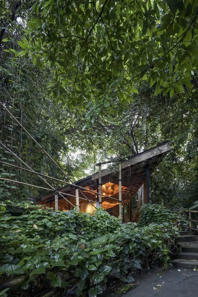 The idea was pushed further as the name of Pavilion, damuh, (the Balinese word for ‘dew’) reflects how the structure of Jia Pavilion is seen from the top. It resembles a leaf with water droplets underneath. It portrays refreshment, which accurately describes the event’s intention. The design also adopts the shape of a jungle’s terrain, making it bolder when it comes to bringing nature beyond the boundaries of such a structure. Within the wood-clad pavilion from Kayu Lapis Indonesia, DDAP embraces the surrounding nature, by keeping the integrity of the landscape and harmoniously fitting into the environment.