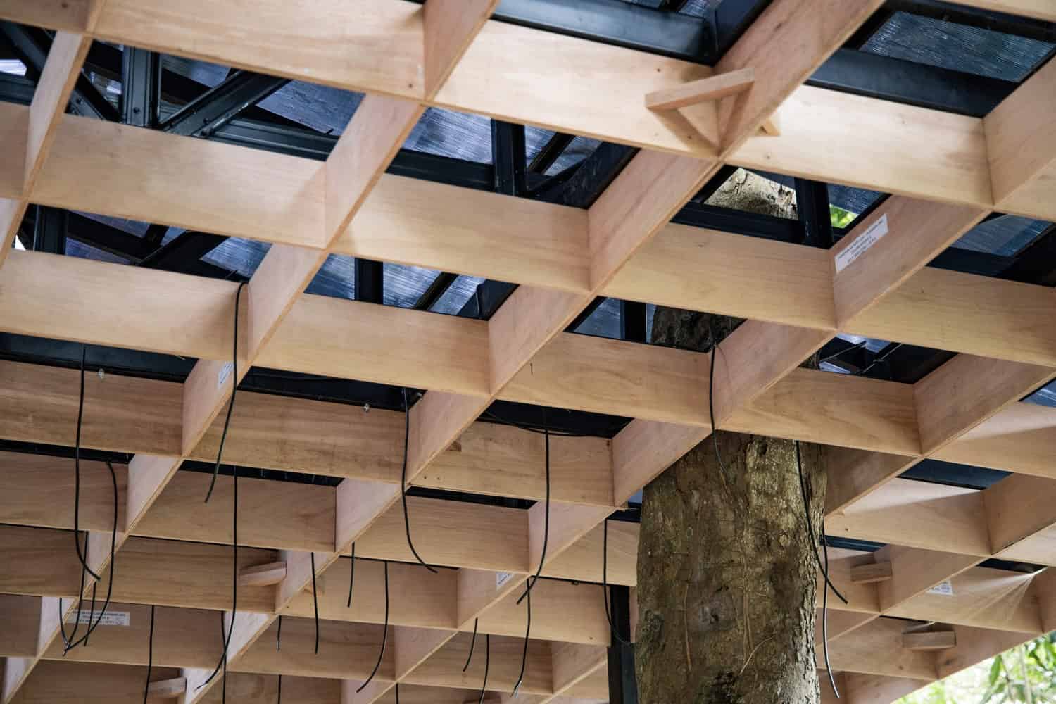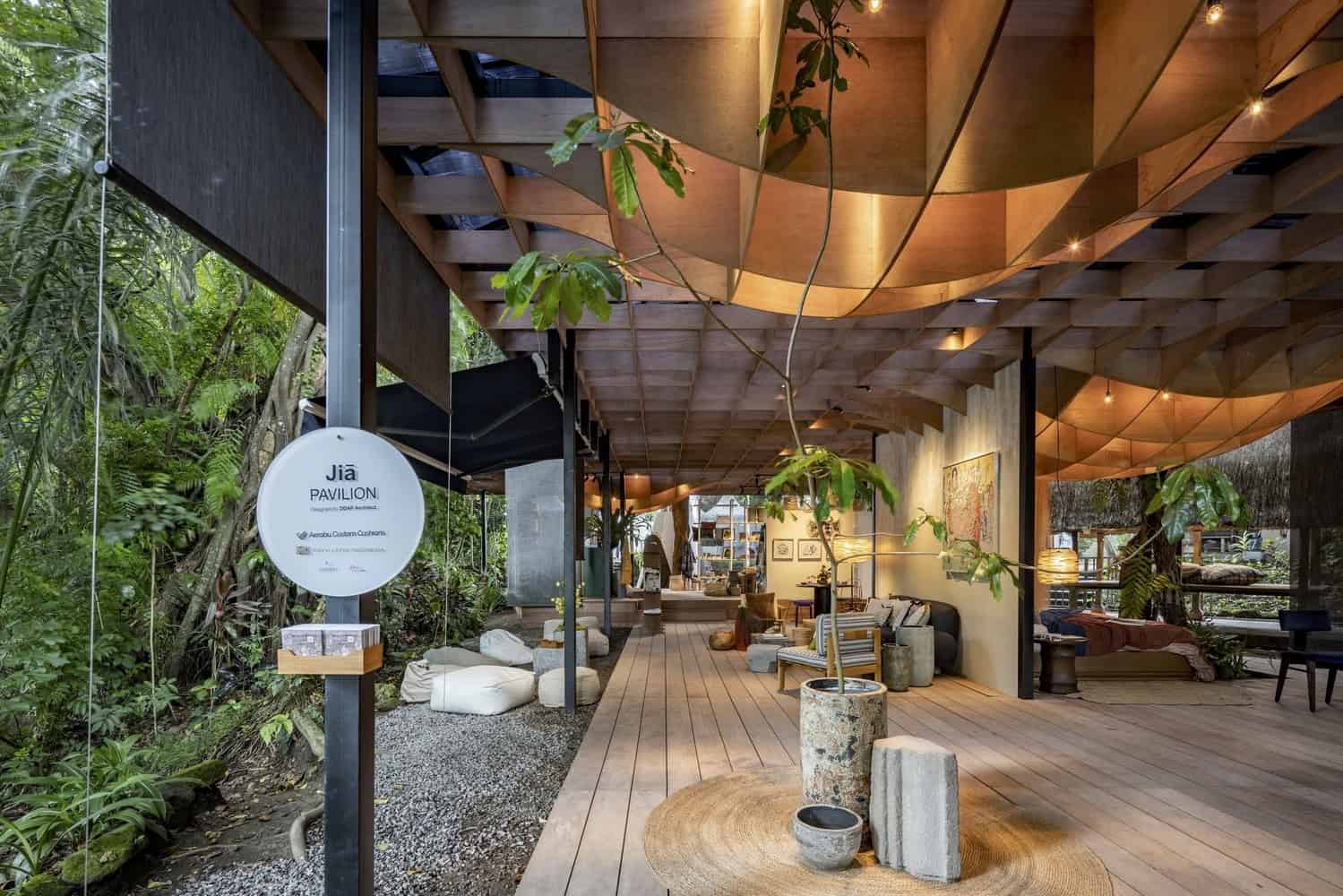 An open-air Jia pavilion is designed by DDAP in the form of a modular and prefabricated system making it more sustainable in a way to be able to repurpose it post-event. Sustainability, less energy, and zero waste are the key principles applied in Jia Pavilion. Using a combination of engineered wood provided by Kayu Lapis, the installation system was well thought to be able to be assembled in just three days. Meranti plywood which is suited for outdoor use was chosen to be used as the ceiling, meanwhile keruing wood with its durability is used for deck flooring. To have the shape of the curves, flexi plywood is the perfect match due to its bendability.