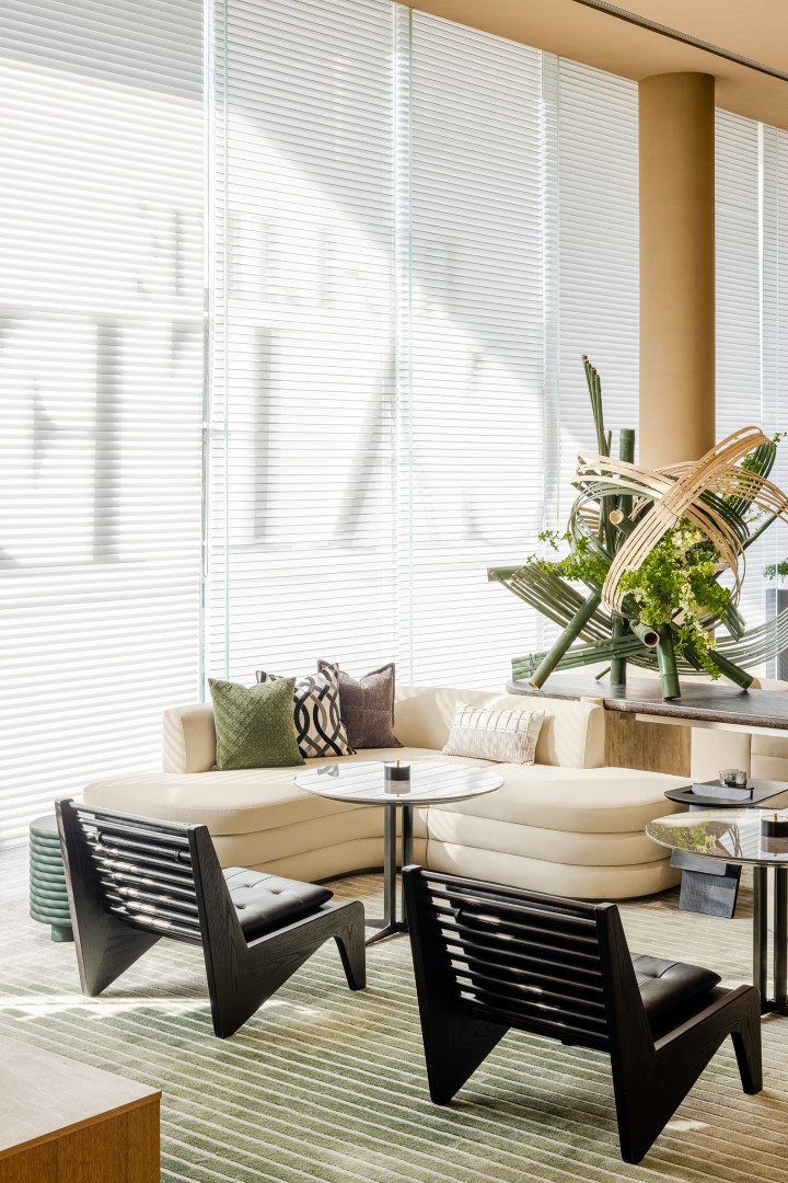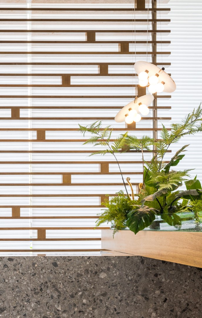 In the clean wooden finishes, with the window blind, the space is full of diversified life forms, establishing dialogue between man and nature. With wooden materials, the interwoven elements display harmonious relationship between nature and art, demonstrating limitless vividness of the nature.