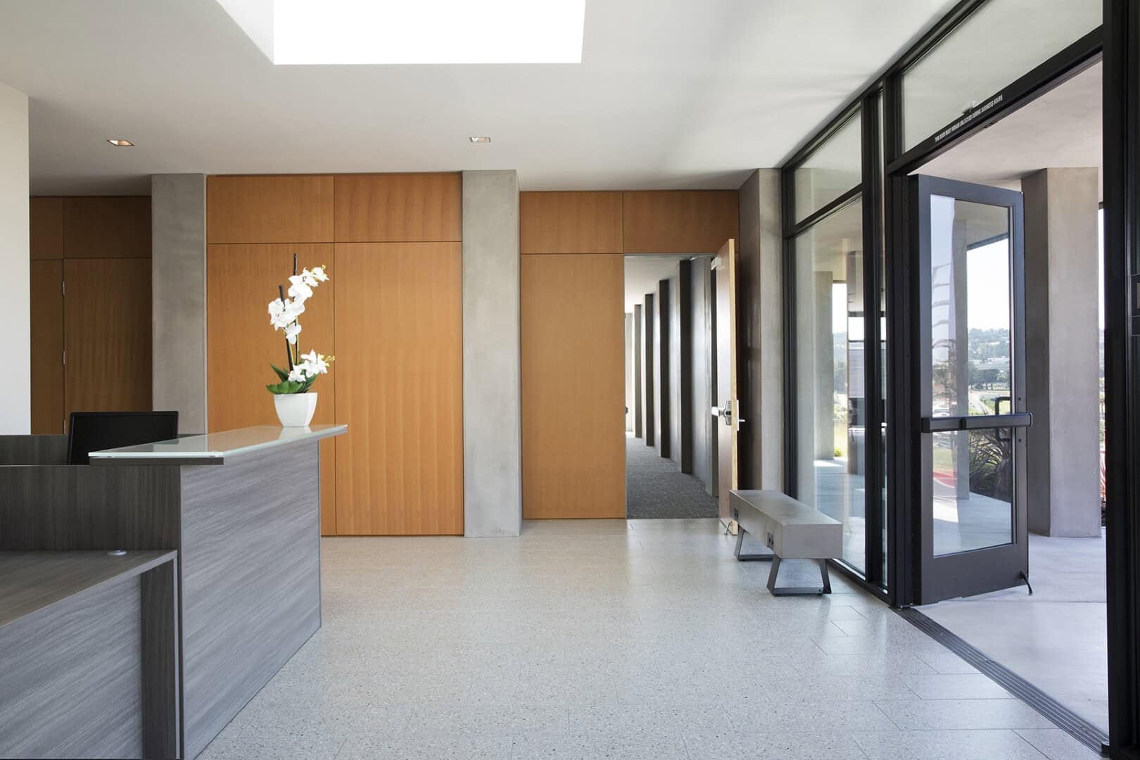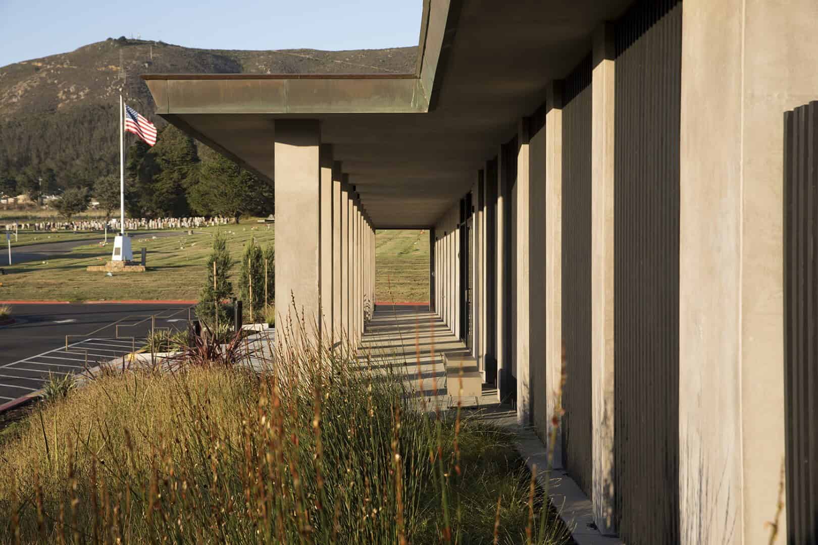 Established in 1896 as the “Cemetery of all Faiths”, Olivet Memorial Park, now known as Cypress Lawn, is one of the oldest cemeteries in Colma, California. Sited at the base of the San Bruno Mountains among a historic landscape of mature cypress and palm trees, Olivet expanded its operations in 2019 with the opening of Olivet Funeral & Cremation Services. While funeral homes tend to be bleak and windowless, Olivet requested that their building capture a newer thought in funeral rituals; a celebration of life. Headquartered on the East Coast, Olivet’s management team specifically wanted a space to better serve their multi-cultural community and be truly California in feel. They enlisted San Francisco-based John Lum Architecture to design a light and airy space that is non-denominational and areligious in its symbology.