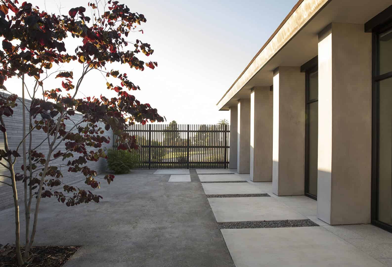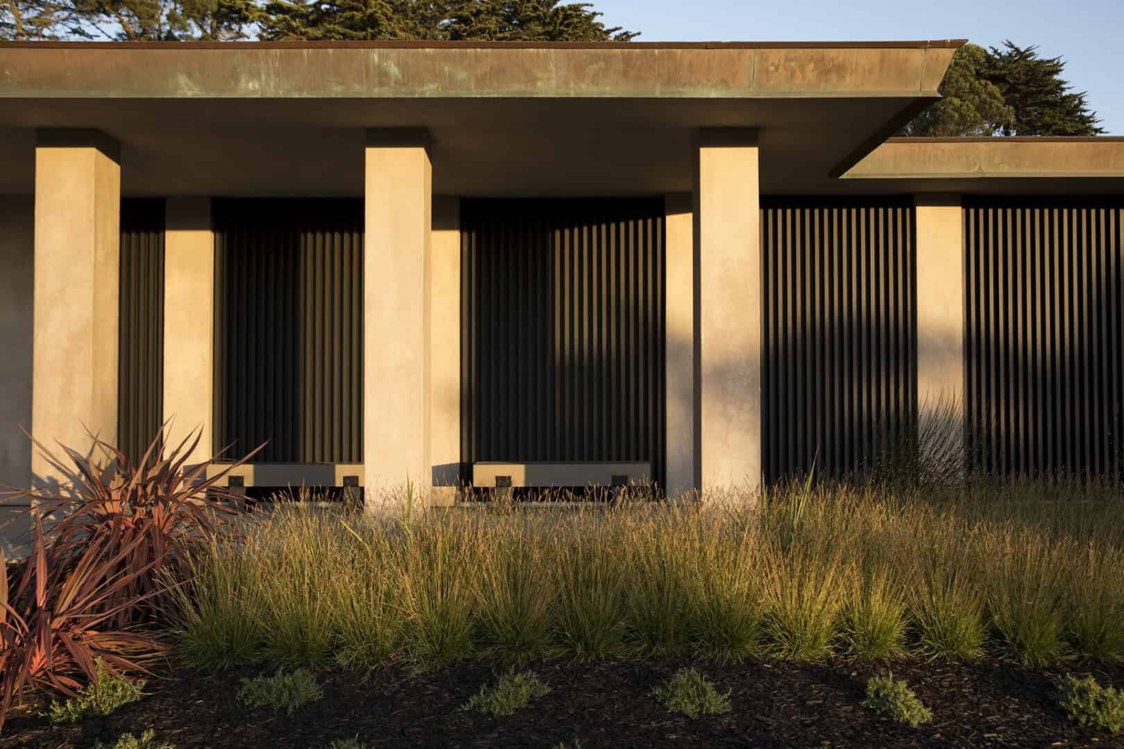 The mid-century modern building features a low, horizontal profile stretched across a gently-sloped lawn. Referencing classical structures, the exterior features an inviting terrace with concrete pillars and shou-shugi-ban wood-slatted screens that play with shadow and light. Concrete benches encourage guests to linger, recognizing that celebrations require informal areas for families to gather. The copper sheathing cornice, which has started to patina, like life weathers with time. Materials were chosen for longevity. The concept was to design a building with high quality materials that have a natural aging process, serving as a reminder of spiritual transformations.