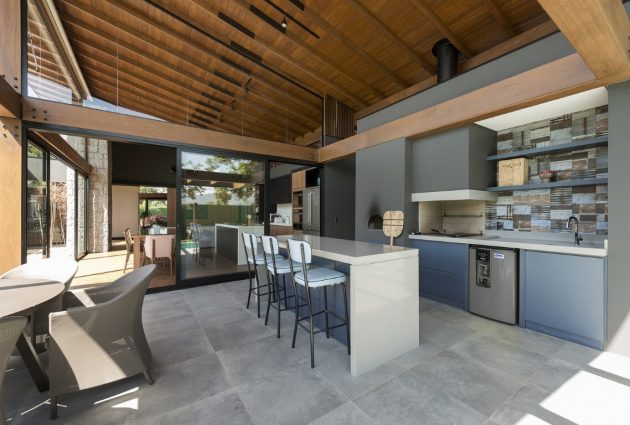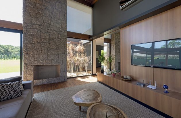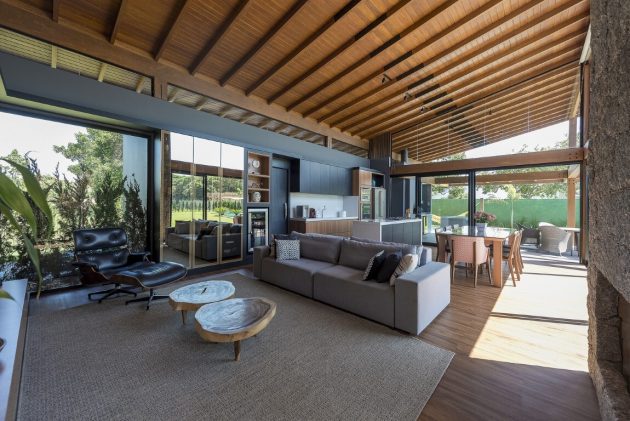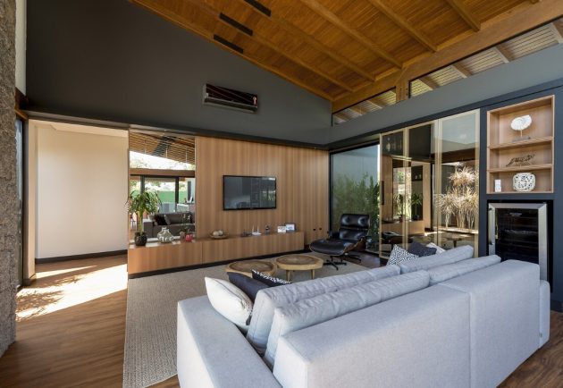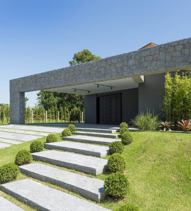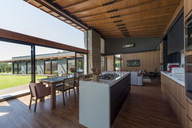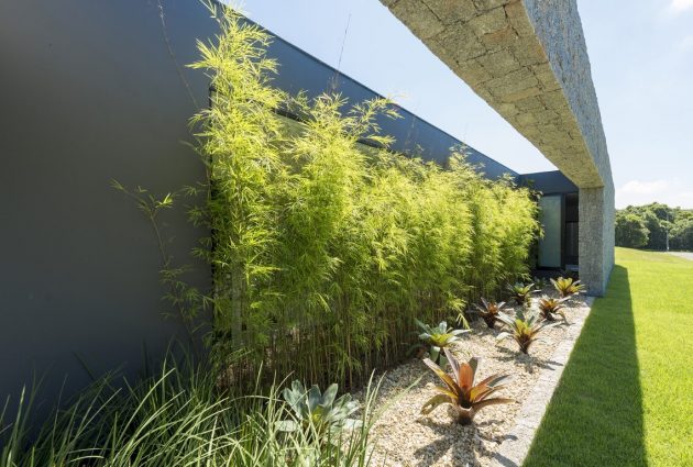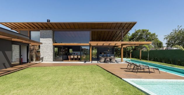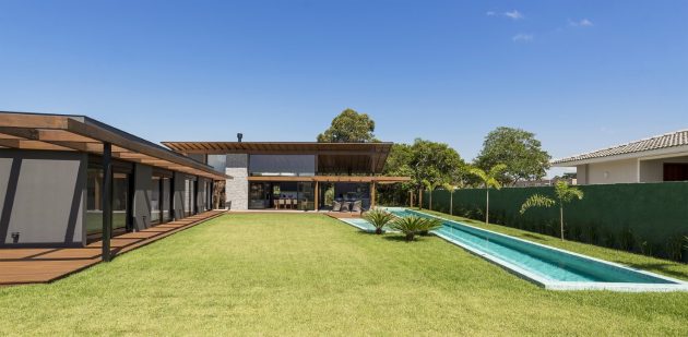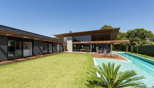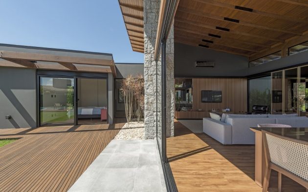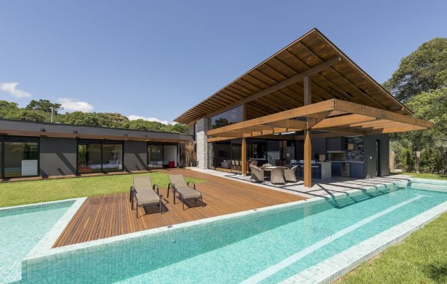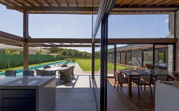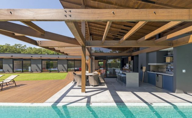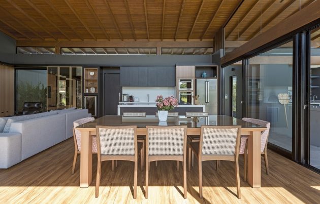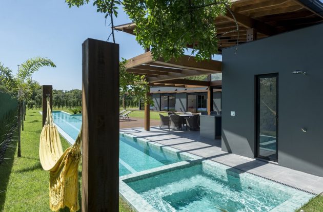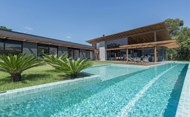 The JP Residence is a spectacular contemporary home located near a lagoon in Aracatuba, Brazil. This luxurious home only spans across a single level but what it lacks in verticality, it makes up in spaciousness both on the inside and the outside. Its mid-century modern take on the interior design expands outwards towards a beautifully landscaped garden with a modern patio right next to the swimming pool.