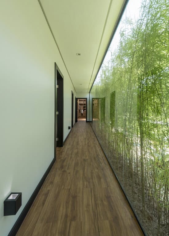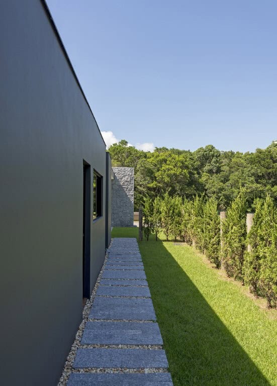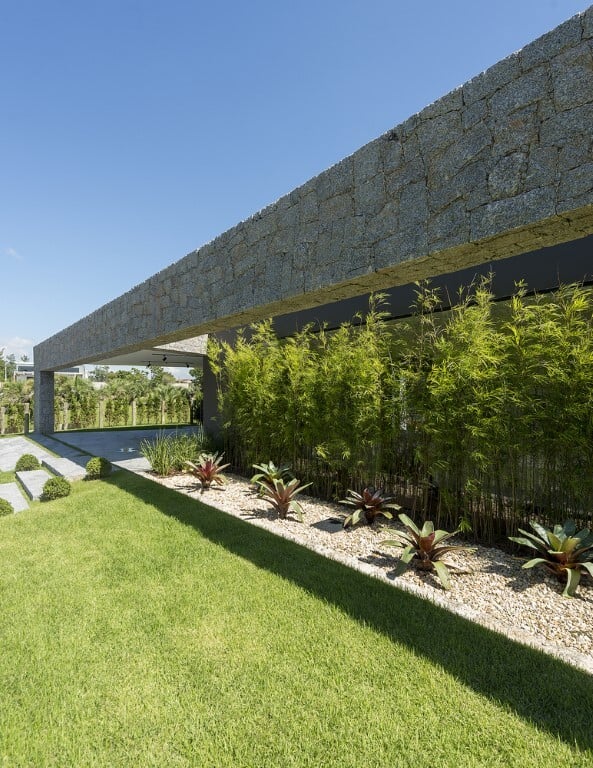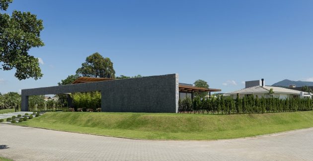 In a corner lot with 1,119.66m², approximately 400 meters from the nearby lagoon, the single story building was implemented due to climatic conditions, the immediate surroundings, the trapezoidal shape of the site and the client’s intentions to have a residence that could enjoy the connection between the indoor spaces and the garden, which also needed to have a 25-meter long streak pool.