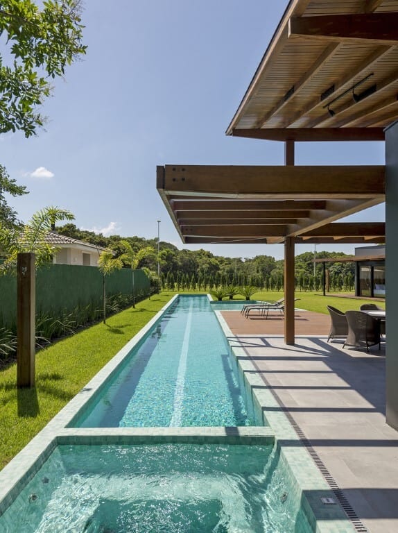 From these guidelines the project was developed with a clear distribution between the intimate area and the social area, and the main access of the residence occurs precisely in the meeting between these two sectors, which were also marked by the formal characteristics of each on. The Intimate area has a lower ceiling and a volume without roof, whereas the social area has a more generous ceiling height with a shed roof and apparent woodwork. Considering the greater possible use of the integration between the external and internal area, the building was implanted within the limits of the frontal and side retreats, in order to create a large central patio, where all the rooms are turned towards, which was enriched by the great green lawn area and the pool with a 25-meter streak and a spa in the far end of it.