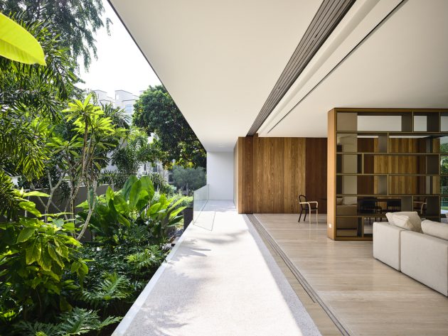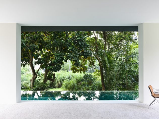 The defunct railway, now a preserved green corridor, provides a backdrop of natural tropical terrain. Seeking to capitalize on the beauty of the home’s splendid surroundings, the design team adopted the Japanese design principle of Shakkei, or borrowed view. Their intention was to create a home resplendent in the “likeness of nature, capturing nature alive to create a spectacular vision”.