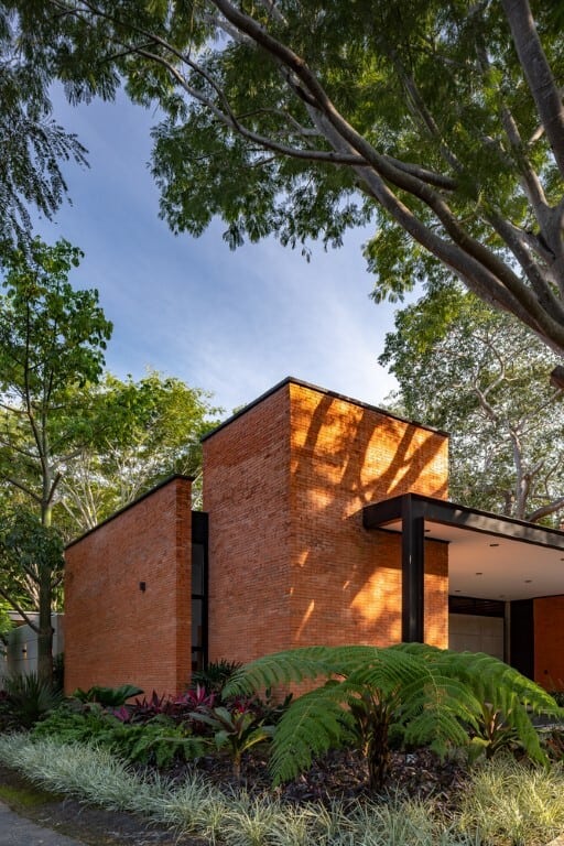 Red brick, crafted by local artisans, forms tactile volumes that resonate with the warmth of the landscape.