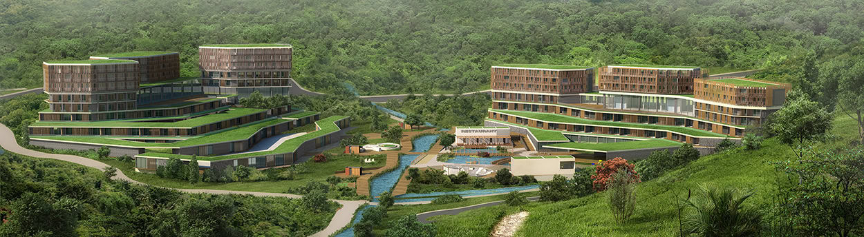 In the project, three different hotel buildings were designed with approximately 592/595/135 total bed amount. . So as not to confine the view of each dwelling unit, the hotel blocks were fragmented towards the upper storeys and staggered in keeping with the topography towards the lower storeys. Staggering these lower storeys facilitated entry from outside, giving users easier access to open air thermal swimming pools, the spa centre, Turkish baths, sports centre, beauty centre, recreation rooms and other community units. The axis of the stream that flows through the least steep section of the site towards the stream was defined as the project’s main recreation line, where social interaction increased with the presence of the hotels. This line, which finally meets the shore, attracts users from the entire project area due to its position at the centre of the site, and both physical and functional structure. Using diverse landscaping elements and pavilions, by widening the stream and incorporating it into the design, it has become a prominent feature and the spine of the project.