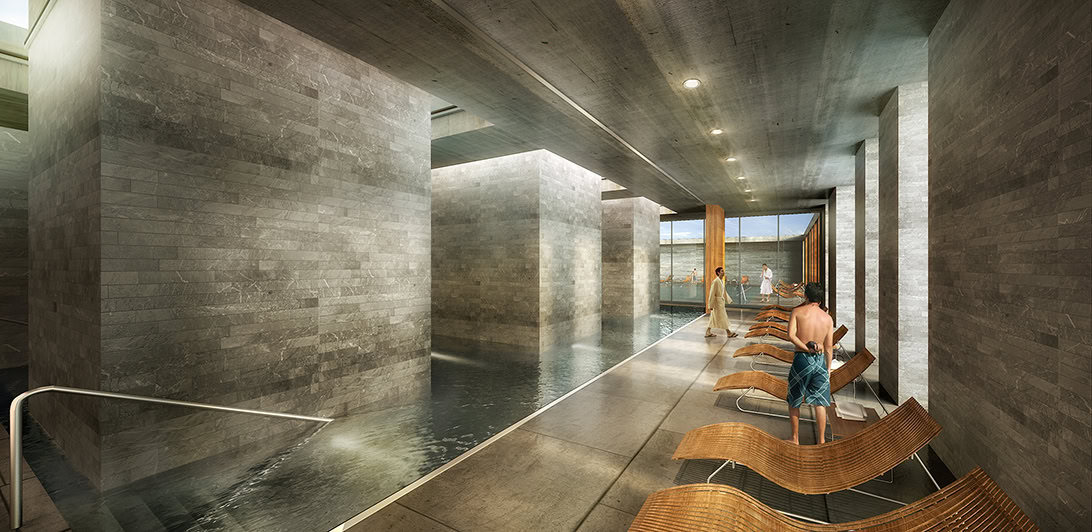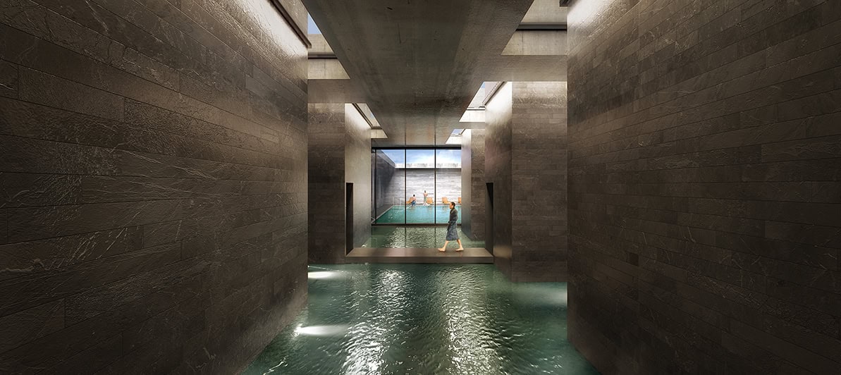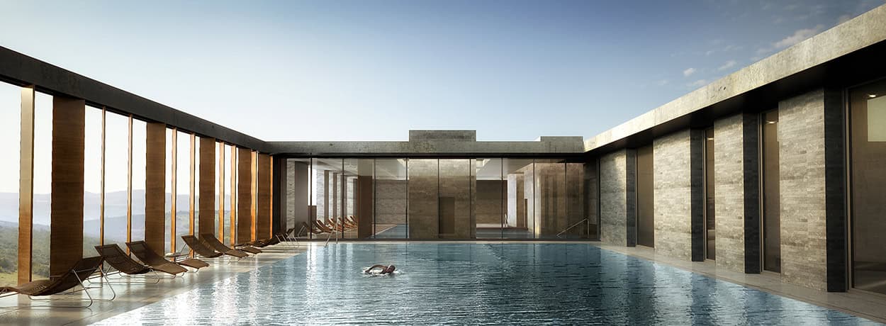 The social facility units, which aim to bring the users together with thermal water resources, another natural beauty of the region, were embedded in different elevations and hidden in the land as much as possible. Social facilities involve unity of the green and water with the thermal and freshwater pools and green inner courts. In the thermal pool area, small private cubic rooms were designed inside the thermal water pool area. And the daylight usage was provided in whole area through examining the historical Turkish bath typology. While designing the space setup of these social facility units, being inside and outside of the building was reconsidered and a visual connection between thermal water and freshwater was built.
