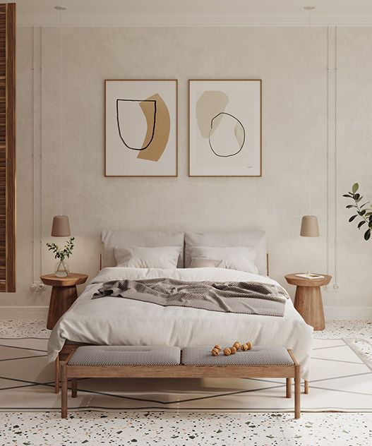 Various raw tones are combined with greenery in the bedroom to create a very refreshing atmosphere. The headboard model and the natural fibre mirrors were can be hung on the wall to create a relaxing touch. Chandeliers made of natural raffia with black trim can be installed on either side of the bed. Solid mango wood and rope stool can be placed at the foot of the bed, with a couple of bamboo baskets underneath for storage.