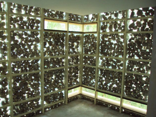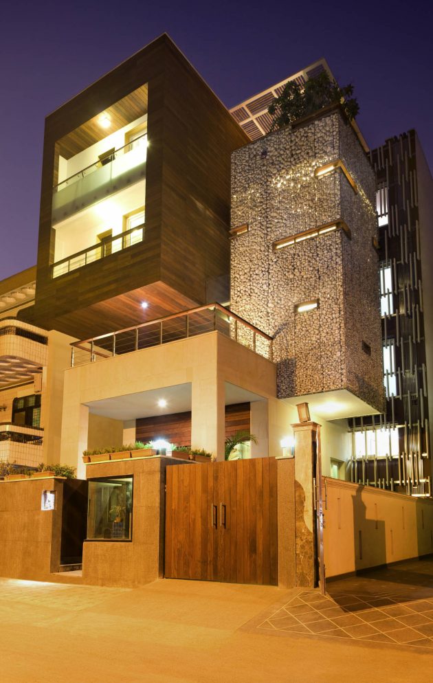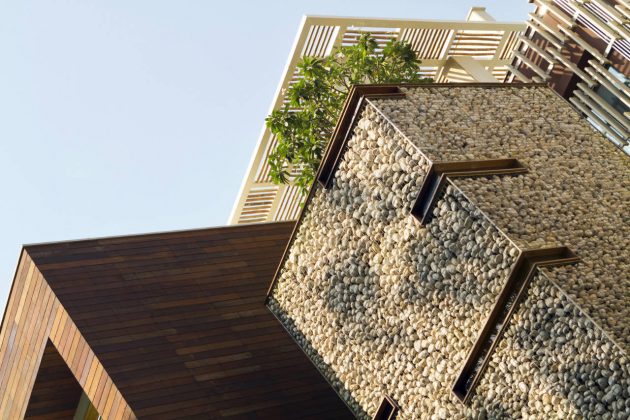 The floating blocks progress from the hollow cube of the entrance porch to the perforated stone gabion of the meditative spaces to the wood clad guestroom block and ultimately to the brise soleil stone slab enmeshed, rear monolithic block.”