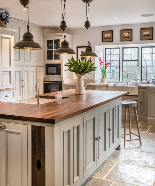 1. A vintage farmhouse look, warm American black walnut island countertop and large-format stone tiles made this English kitchen photo the most popular of 2016.