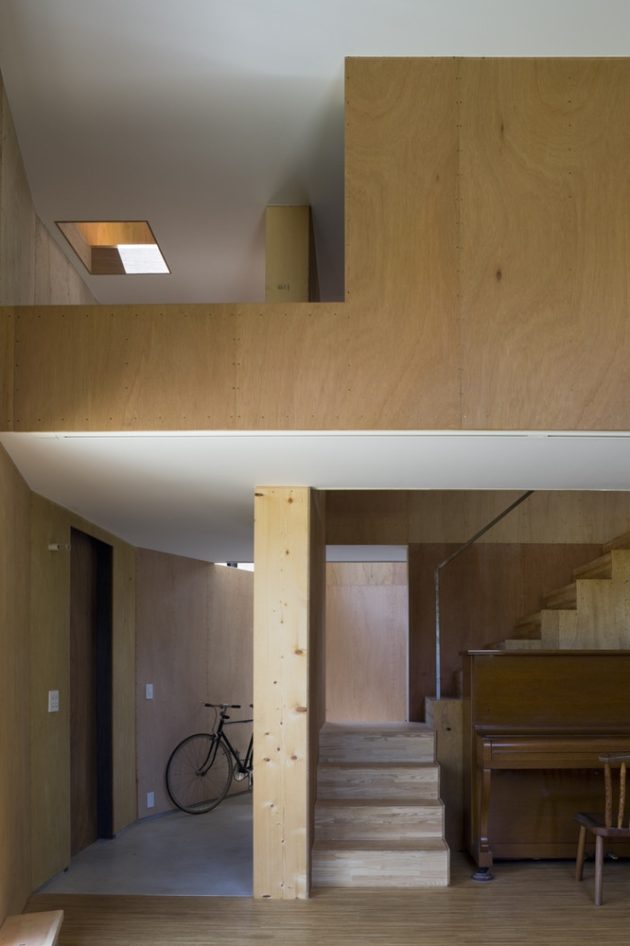 A space is divided into east and west by the stairs in the center. And cross-sectionally, the storage space with half-floor height (CH=1.4m) is inserted between the ground and the first floor on the south, and between the first floor and the roof on the north. This split-level system stretches the space in a vertical direction, and creates the spaces with various volumes. It makes the complex sequence, such as the space on the first floor appearing from the well of 1.5 stories on the ground floor, or the upper and lower floor being overlooked in the same time. You can hear the voice and feel someone’s presence, however you can’t see him.