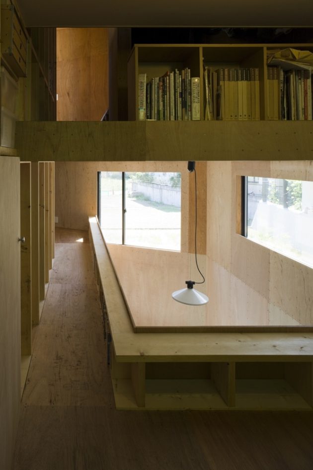 Because the clients were an illustrator and a crafter, we leave the space for them to arrange during their life there; the finishing of the wall is exposed structural lauan plywood without any furniture and shelves. Each time we visit there after construction, we find the handcraft furniture, for example a post at the entrance, desks at children space and shelves between two-by-four posts which is made by left-over wood.