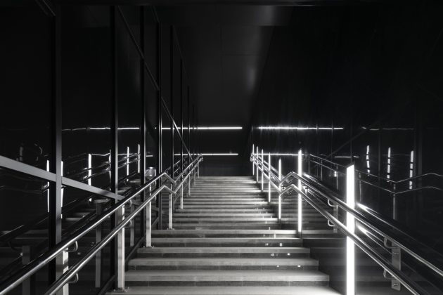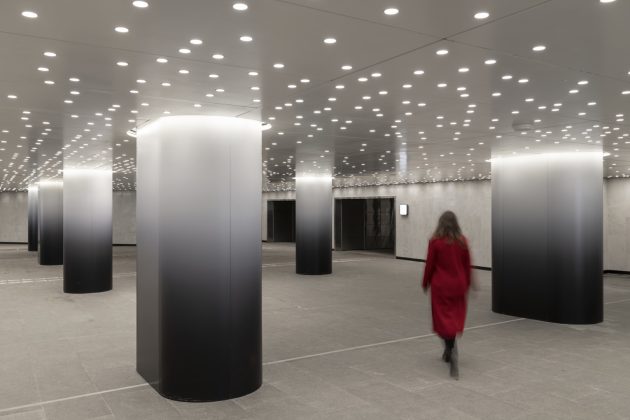 By day, the pavilion appears refined and understated, while at night, perimeter roof lighting transforms the building into a glowing beacon of modern infrastructure. The layered lighting design inside the pavilion uses uplighting to accentuate wall textures, a large lightbox across the entrance, and mirrored ceiling panels that reflect daylight and artificial light for a dynamic visual effect.