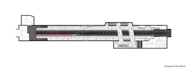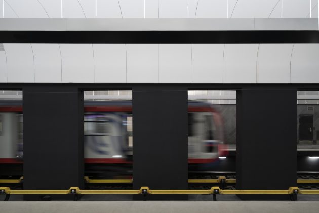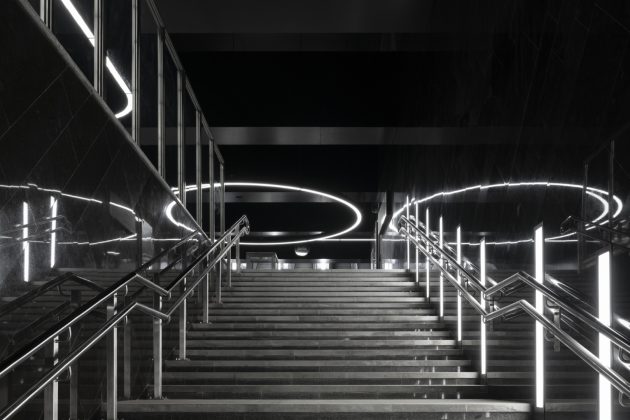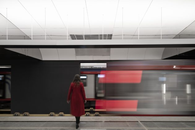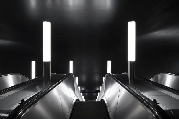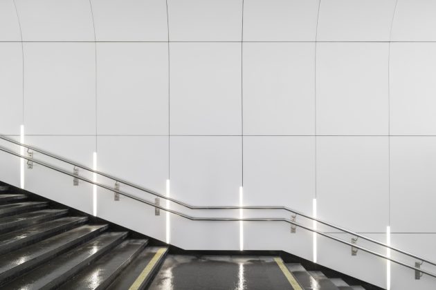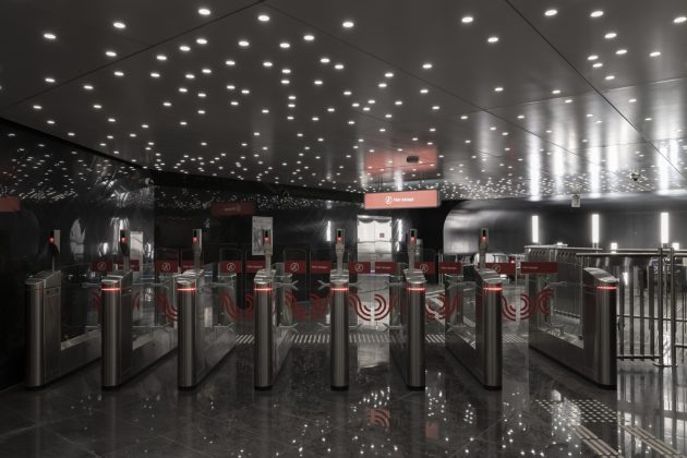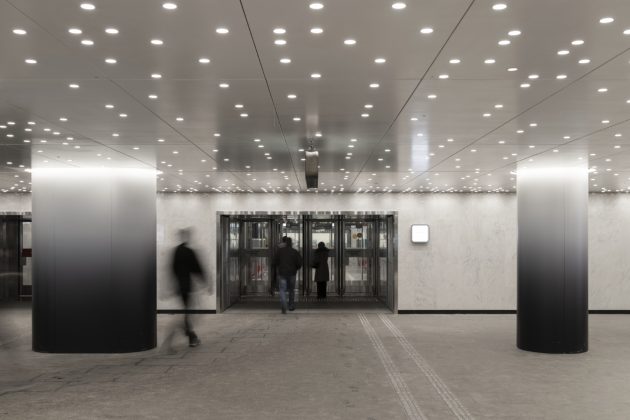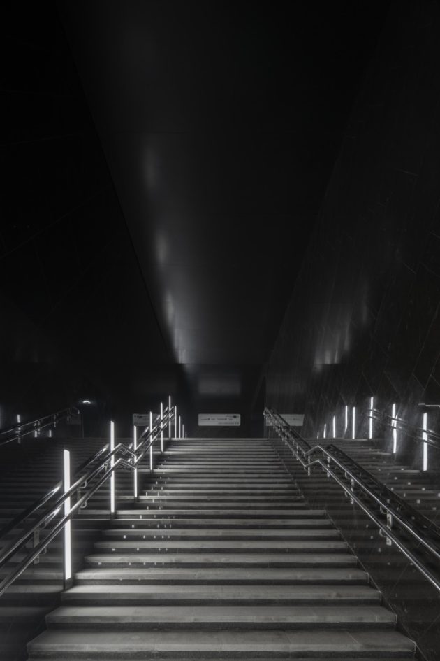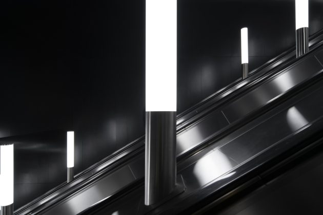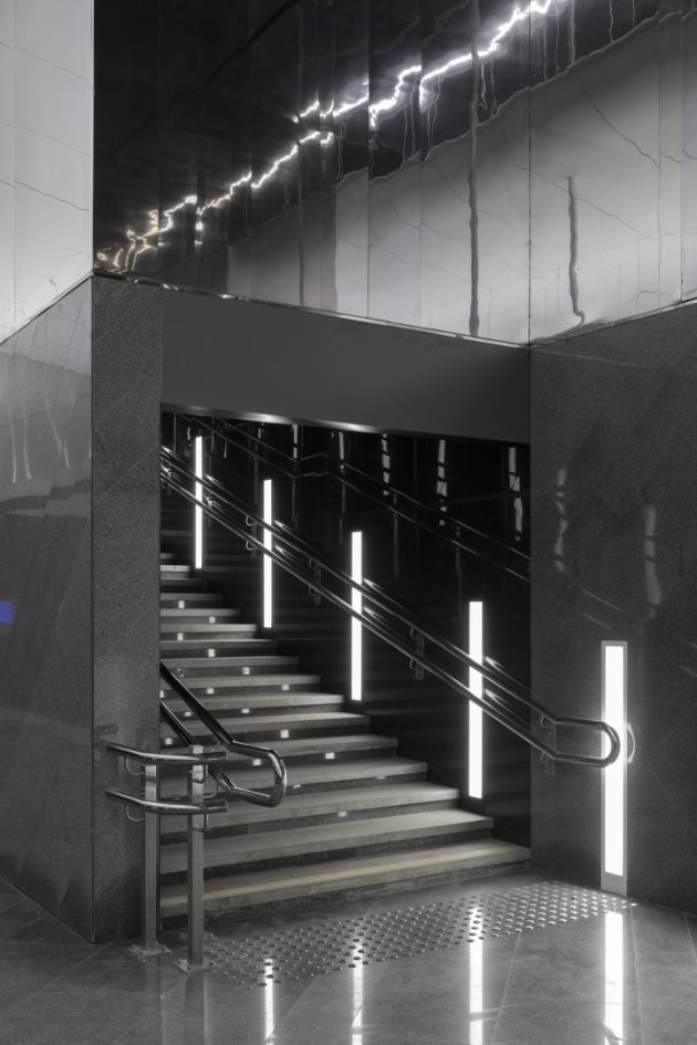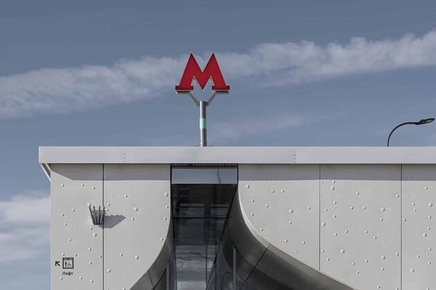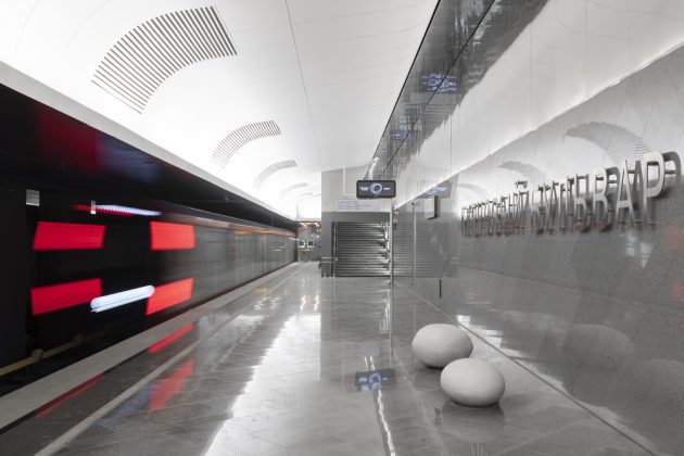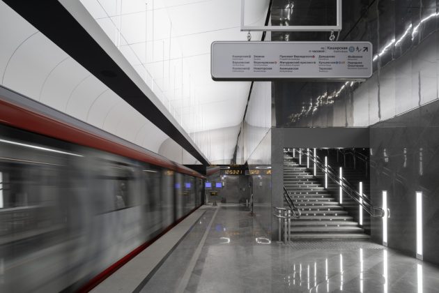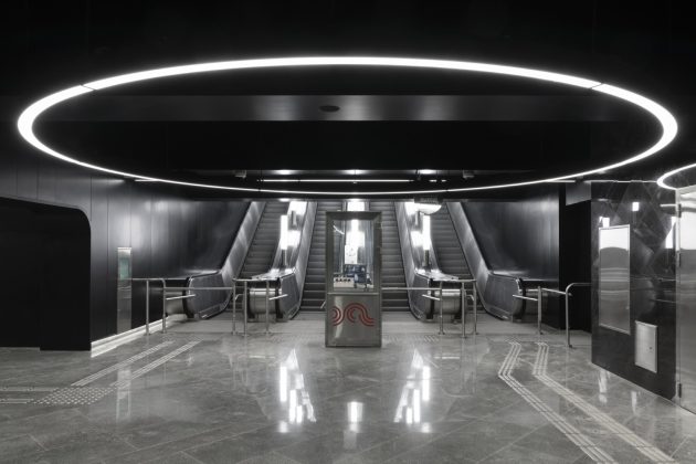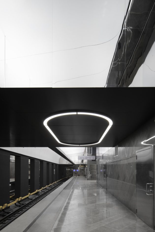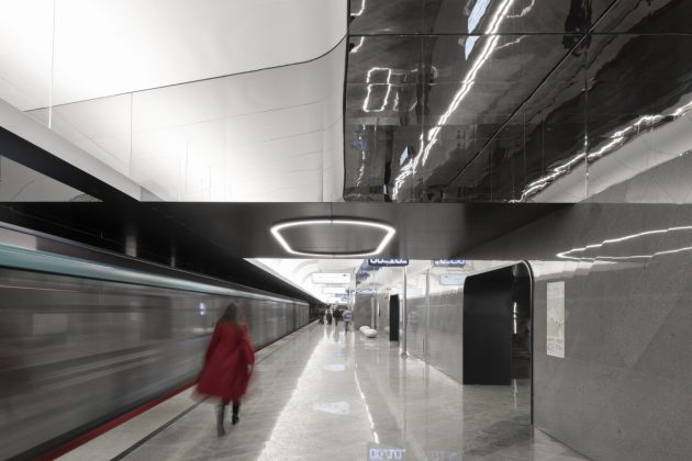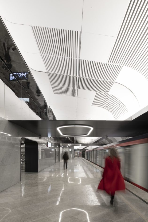 Inside, the station adopts a monochrome palette of marble, granite, and aluminum, emphasizing both purity and elegance. The design reinterprets the traditional Russian dome through the vaulted ceiling above the platforms. Cleverly, only half of the dome is physically constructed—the other half appears through mirrored wall panels, creating a complete silhouette through reflection.