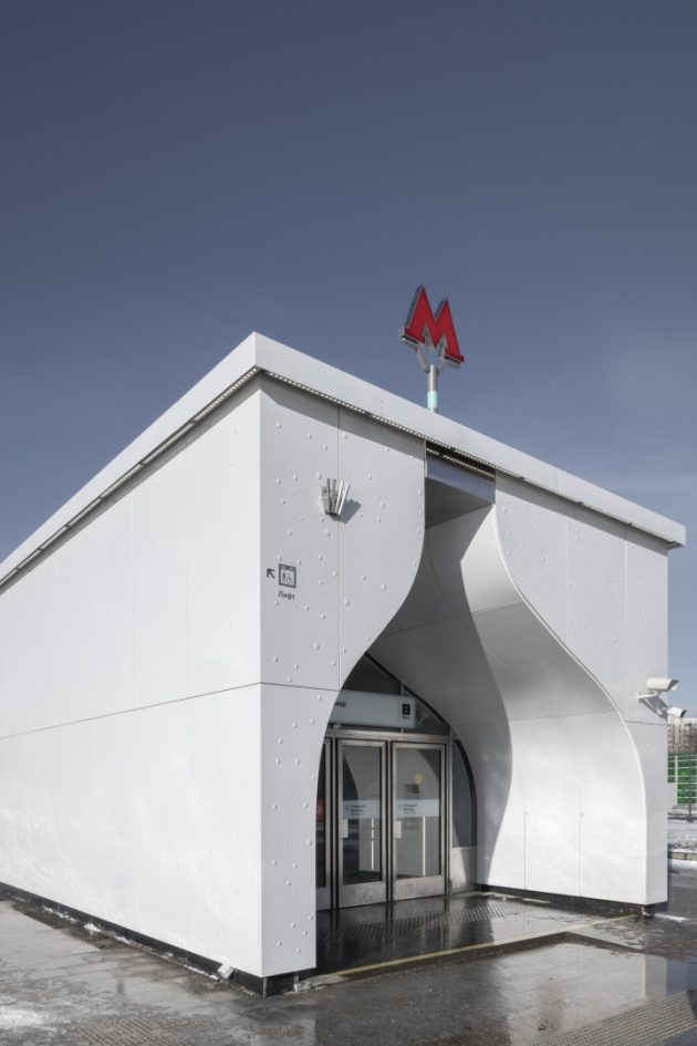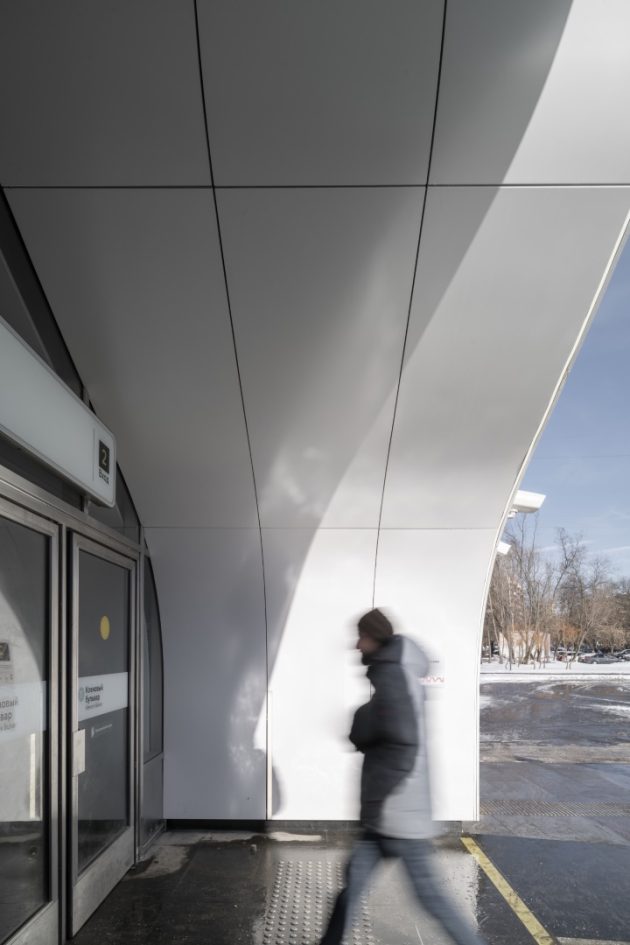 The entrance pavilion is a striking blend of modernity and tradition. Its soft, domed silhouettes reinterpret the architectural motifs of Kolomenskoye, while embossed metal panels reference the Dyakovo culture of reticulated ceramics, a tradition rooted in the area. The dotted, illuminated façade creates a sense of lightness, transitioning seamlessly into the underground lobby’s ceiling finish.