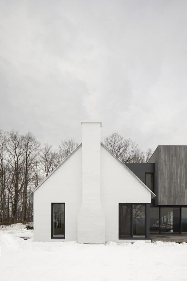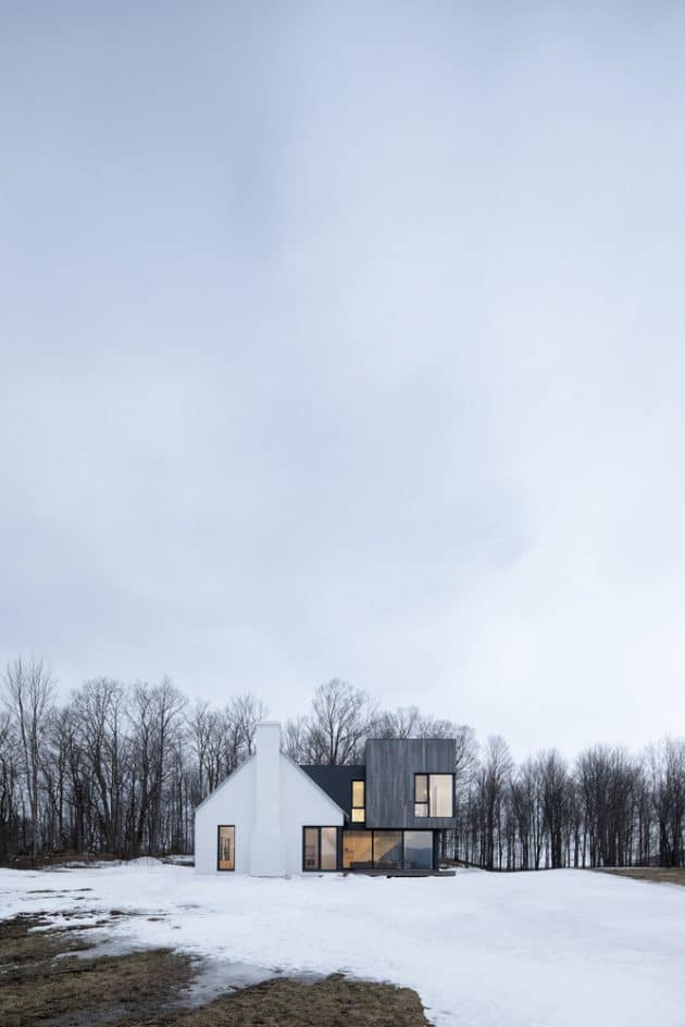 Thomas Balaban Architect, a studio from Montreal, has designed a cedar-clad extension for a modern farmhouse in the Lac-Brome area of Quebec, Canada. The weathered cedar cladding is a nice touch of contrast to the white farmhouse exterior and the snowy landscape around it.