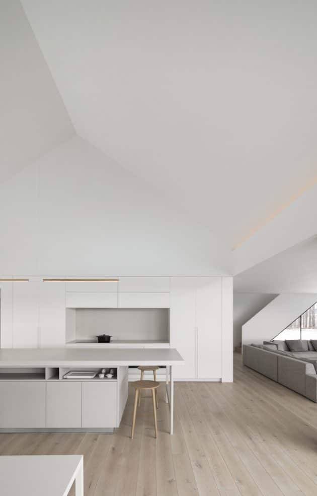 The box shaped extension plays off the familiar farmhouse typology, creating a series of intriguing contrasts between the thisness and thatness of the composition, both distinguishing and uniting different eras, forms, and materials. A new sleek corrugated metal roof and painted white brick update the existing structure while the new extension is clad in custom cedar boarding, charred and silvered to replicate weathered wood. The detailing remains modern and minimalist. However, both materials speak to the numerous old barns and newer agricultural sheds found throughout the Eastern Townships.
