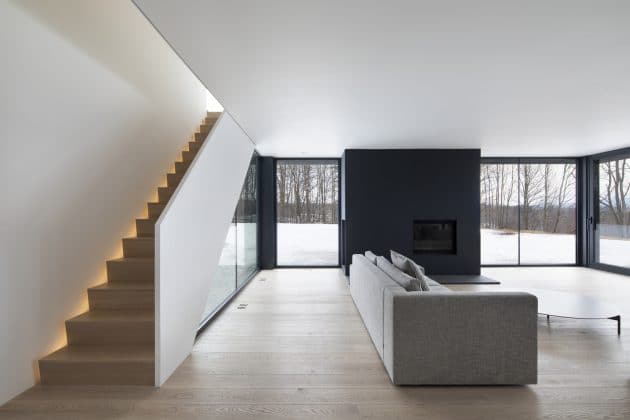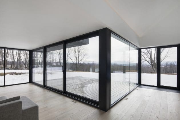 On the lower level, a band of windows cuts across both structures – a void that ties together the contrasting forms. It wraps around the social spaces, giving out onto the majestic views of Brome Lake Valley and Mont Sutton. Upstairs, punched openings frame views of the property’s mature trees. These dark framed openings, a simple material palette, and minimal detailing connect the interior spaces, subtlety highlighted geometric variations and moments where spatial intimacy meets openness.