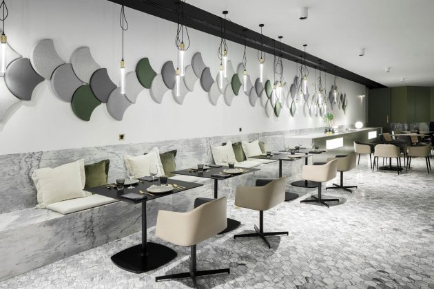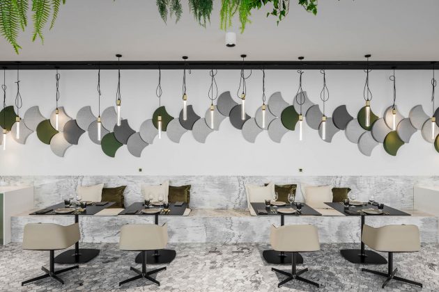 The restaurant is characterized as an interior garden, an integral part of the exterior, mirroring the same symbolism and balance, with the presence of vegetation that flows through the ceilings, in line with the various moments of artificial lighting with scenic effect, and the acoustic panels that, in addition to their primary function, assume the carp form: symbol of prosperity, longevity and fertility.