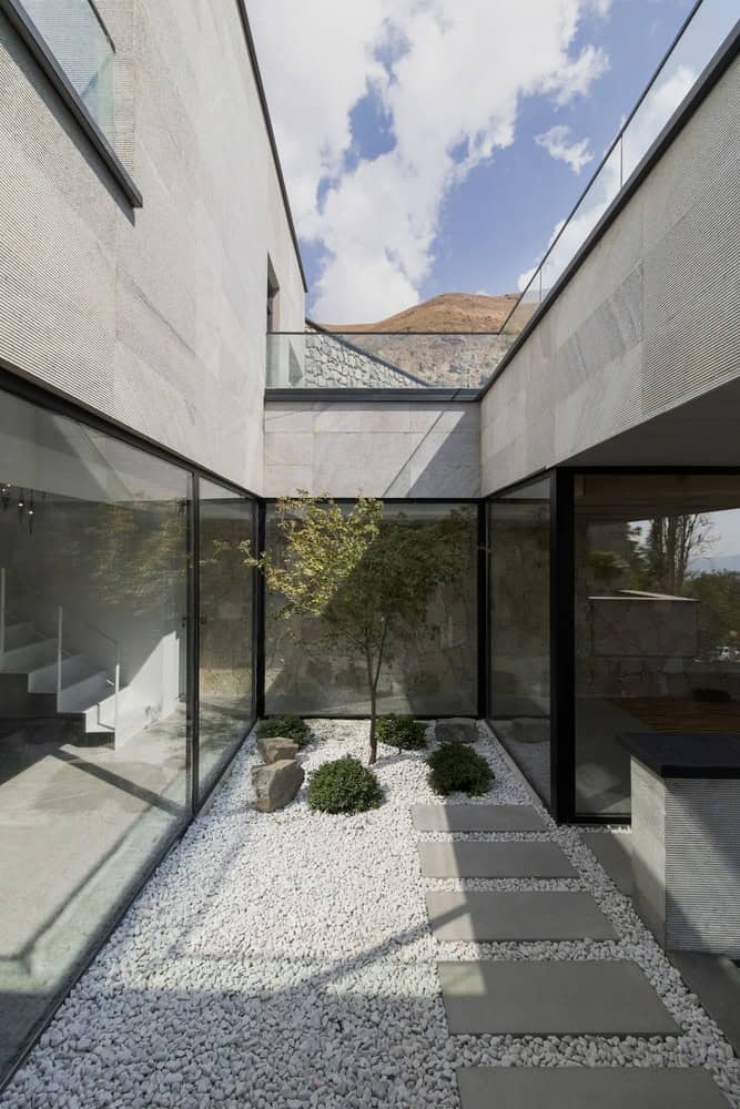 On the middle level, it forms a courtyard, introducing greenery and natural light to private spaces.