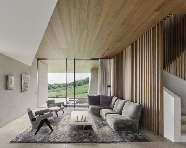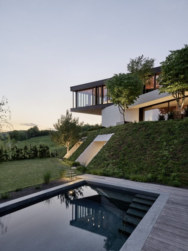 Despite its contemporary expression, the house demonstrates sensitivity to its surroundings. By embedding part of its mass into the earth, using natural materials, and carefully framing views, the residence presents itself with a quiet yet confident presence. It is distinctly modern yet deeply tied to the local landscape, standing as both landmark and neighbor.