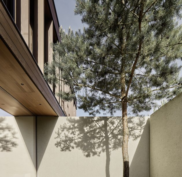 The timber fins provide both aesthetic and functional roles, offering privacy, solar shading, and a rhythm that echoes the natural conditions of the site. This elevated volume, hovering above the solidity of concrete, establishes a balance of lightness and strength.