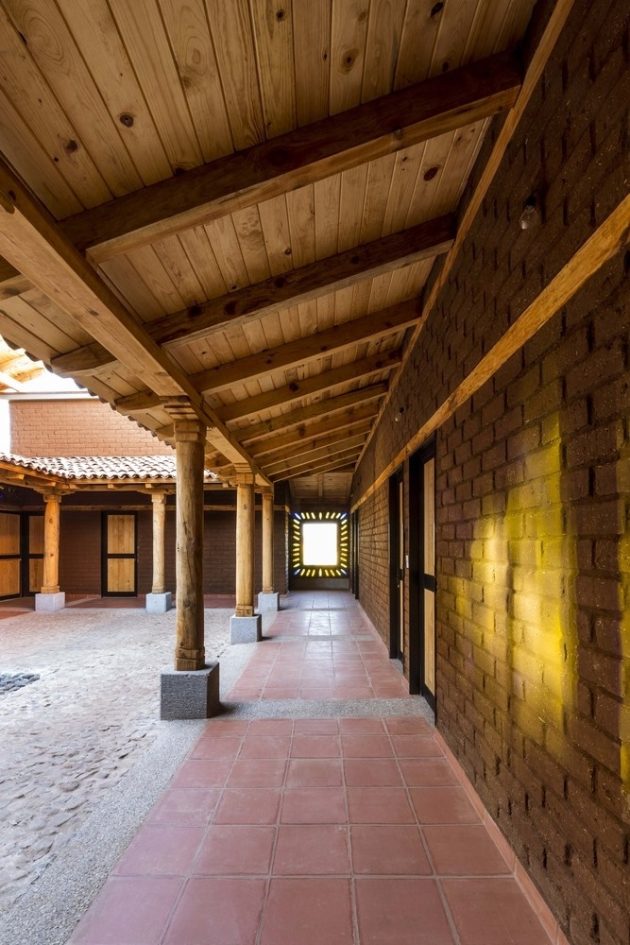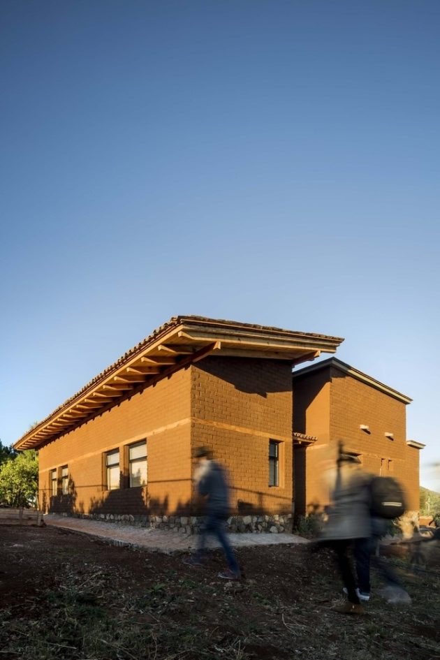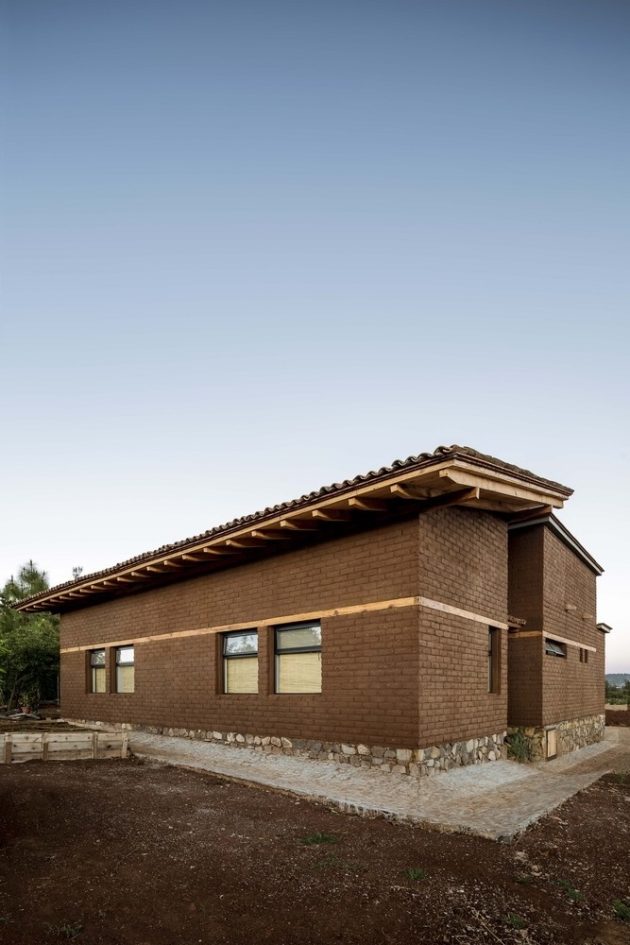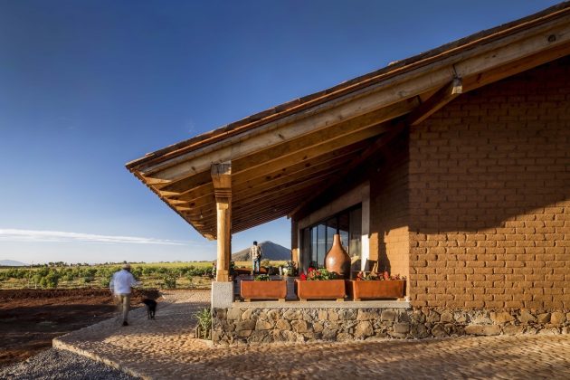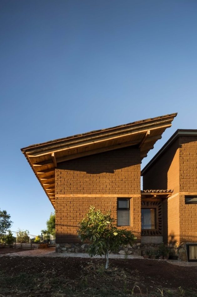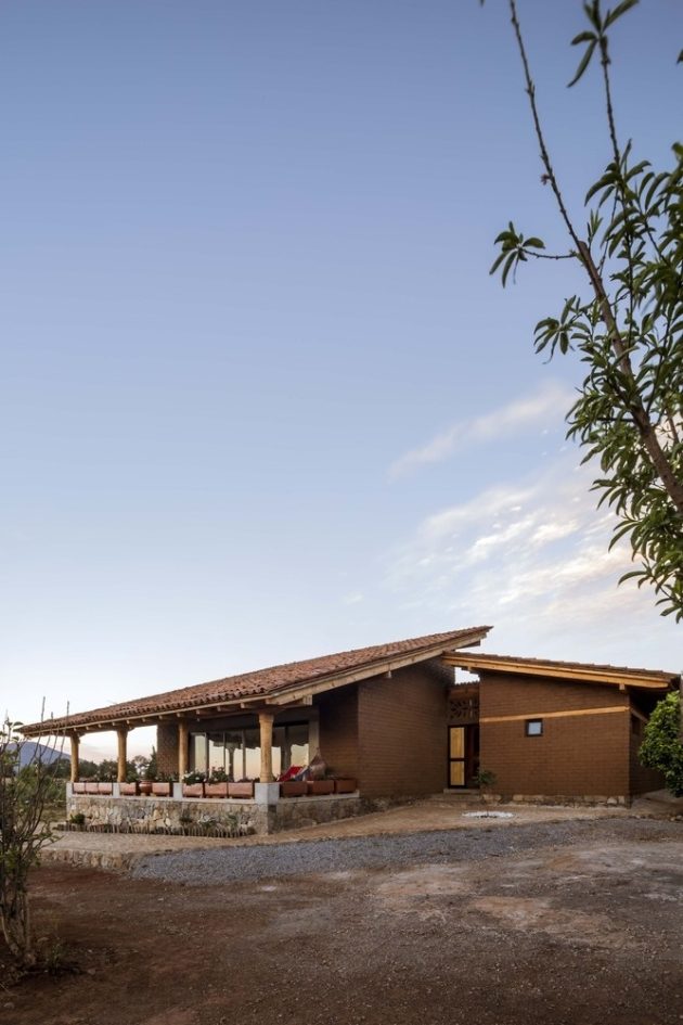 The house is built in the highest part of the land to take advantage of the view and slope. Eco-technologies and natural materials such as braza stone, adobe made on-site, wood, reused tile, and mud floors were used to create the constructive system. The inclined ceilings of wood beams and the roof covered with tiles give the house an authentic and natural ambiance.