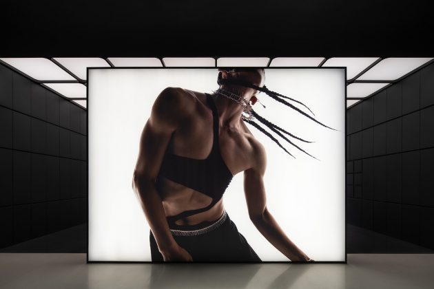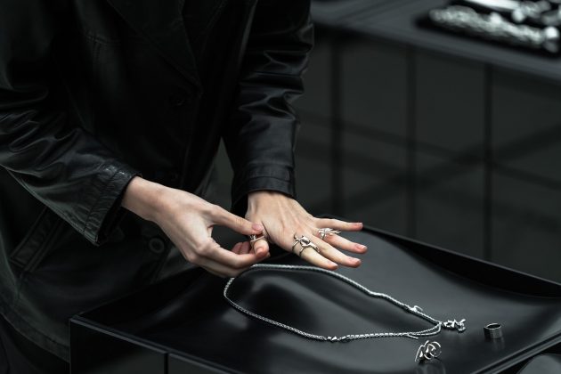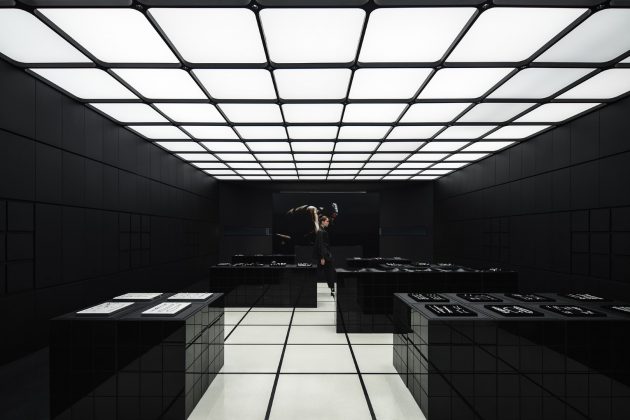 The whole arc-shaped hot curved glass was at the bottom, and the dark green to black color changed. A strange device created with the core inspiration symbols, like a spider’s tentacle, stood between the window, blurring the boundary between art and retail.