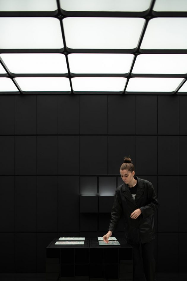The pure black inner wall stands on both sides, with 3×3 free stretching light-emitting modules as a group, which combines the functions of product display and lightening by drawing and pulling together with lighting. When the “drawers” are pulled out, the light turns on immediately. While meeting the display function, the interest is enhanced through the array arrangement, providing different booths for the main body of the space.
