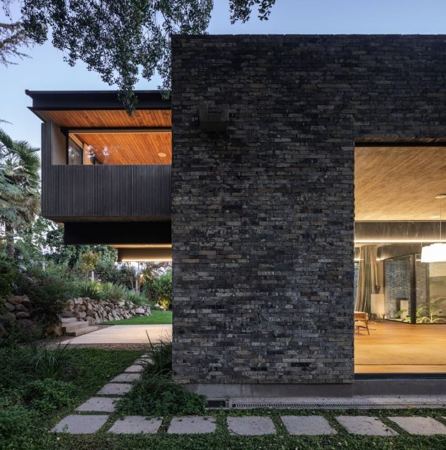 The palette is composed of materials chosen for their durability, expressiveness and low-maintenance qualities. Recycled stone clads the retained structure, while new insertions combine timber, steel and glass accents—nodding to the modernist architectural heritage of the area yet clearly contemporary in articulation. The landscape, with mature trees and sweeping garden lawns, is largely retained and supplemented with native, low-water plants to optimise resource use and maintain continuity with the original setting. Through these choices, the house reads as both grounded in place and forward-looking.