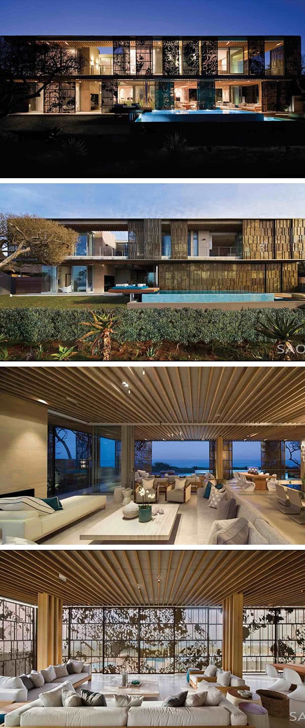 La Lucia house exterior on South Africa’s north coast with articulated bronze screens and coastal vegetation.