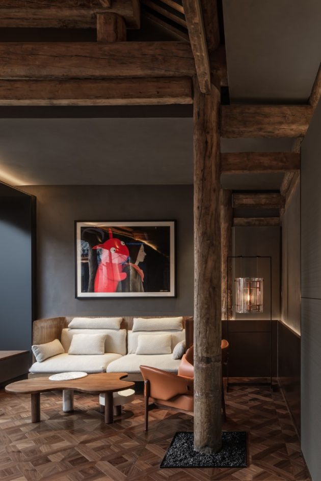 Pieces from Derek Chen’s Maxmarko collection, works from the Chendarui series, and art by Zhang Zhanzhan enrich the environment, blending modern craftsmanship with historic setting. This integration of original artworks ensures the space feels alive, relevant, and future-oriented.